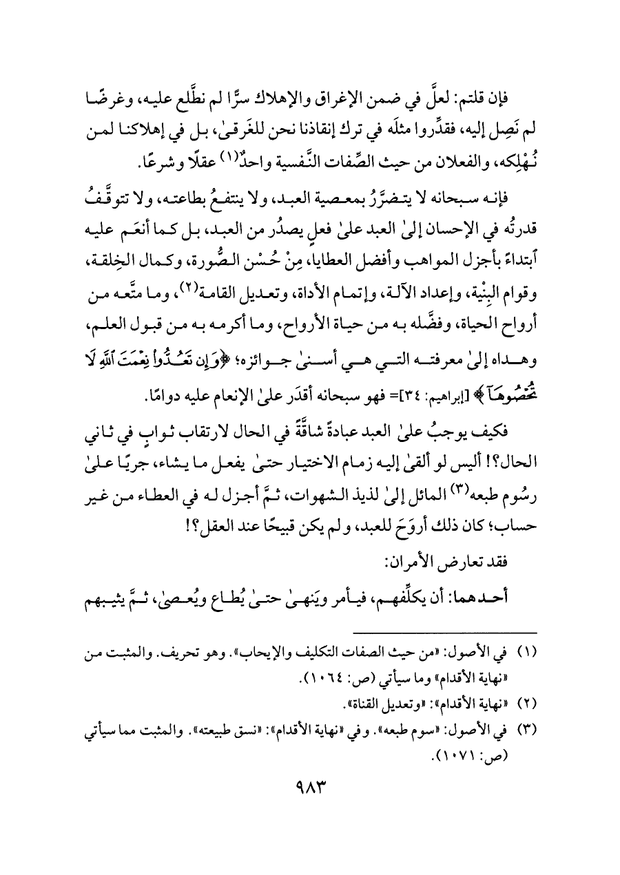 (¬١) في الأصول: «من حيث الصفات التكليف والإيحاب». وهو تحريف. والمثبت من «نهاية الأقدام» وما سيأتي (ص: ١٠٦٤).