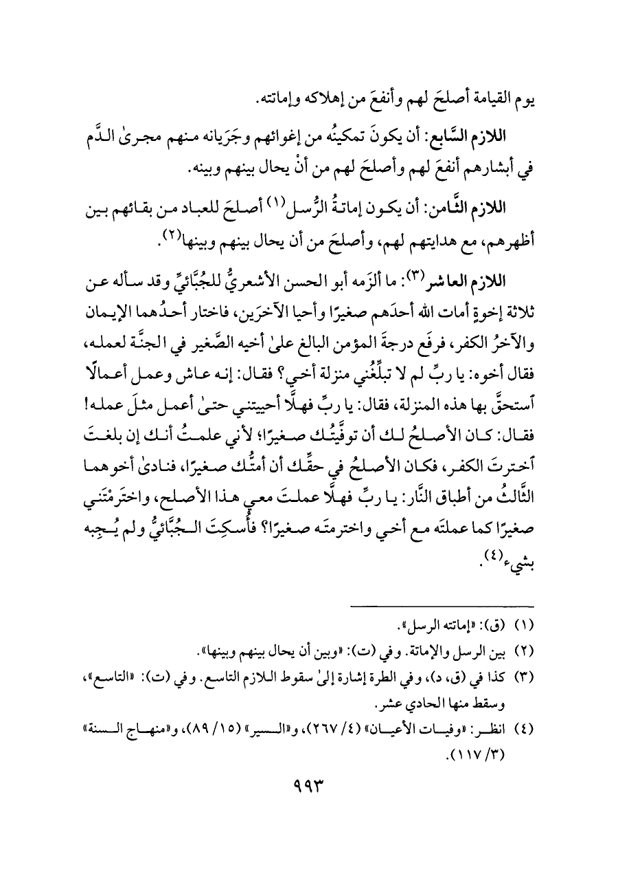 اللازم العاشر (¬٣): ما ألزَمه أبو الحسن الأشعريُّ للجُبَّائيِّ وقد سأله عن ثلاثة إخوةٍ أمات الله أحدَهم صغيرًا وأحيا الآخرَين، فاختار أحدُهما الإيمان والآخرُ الكفر، فرفَع درجةَ المؤمن البالغ على أخيه الصَّغير في الجنَّة لعمله، فقال أخوه: يا ربِّ لم لا تبلِّغُني منزلة أخي؟ فقال: إنه عاش وعمل أعمالًا استحقَّ بها هذه المنزلة، فقال: يا ربِّ فهلَّا أحييتني حتى أعمل مثلَ عمله! فقال: كان الأصلحُ لك أن توفَّيتُك صغيرًا؛ لأني علمتُ أنك إن بلغتَ اخترتَ الكفر، فكان الأصلحُ في حقِّك أن أمتُّك صغيرًا، فنادى أخوهما الثَّالثُ من أطباق النَّار: يا ربِّ فهلَّا عملتَ معي هذا الأصلح، واختَرمْتَني صغيرًا كما عملتَه مع أخي واخترمتَه صغيرًا؟ فأُسكِتَ الجُبَّائيُّ ولم يُجِبه بشيء (¬٤).