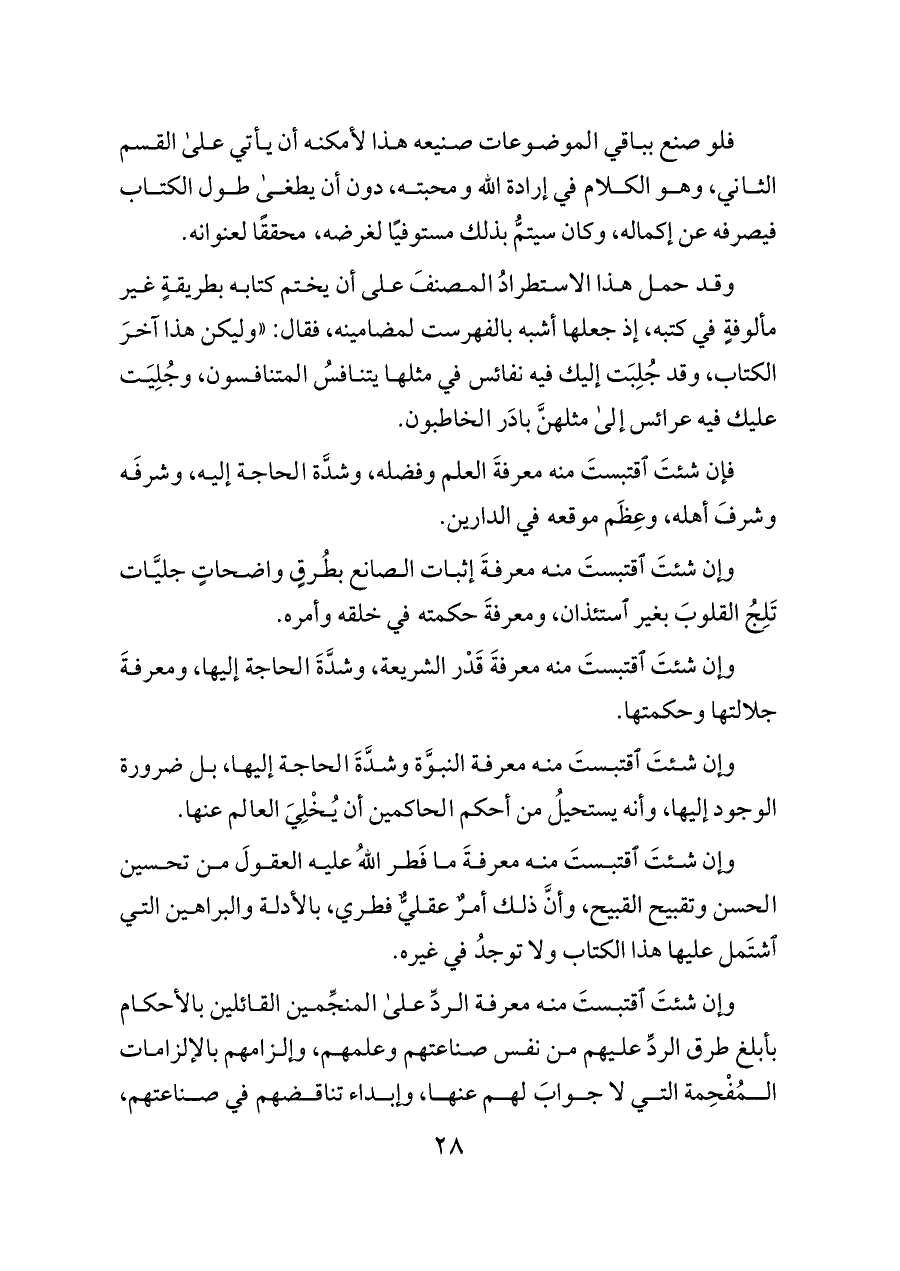 فلو صنع بباقي الموضوعات صنيعه هذا لأمكنه أن يأتي على القسم الثاني، وهو الكلام في إرادة الله ومحبته، دون أن يطغى طول الكتاب فيصرفه عن إكماله، وكان سيتمُّ بذلك مستوفيًا لغرضه، محققًا لعنوانه.