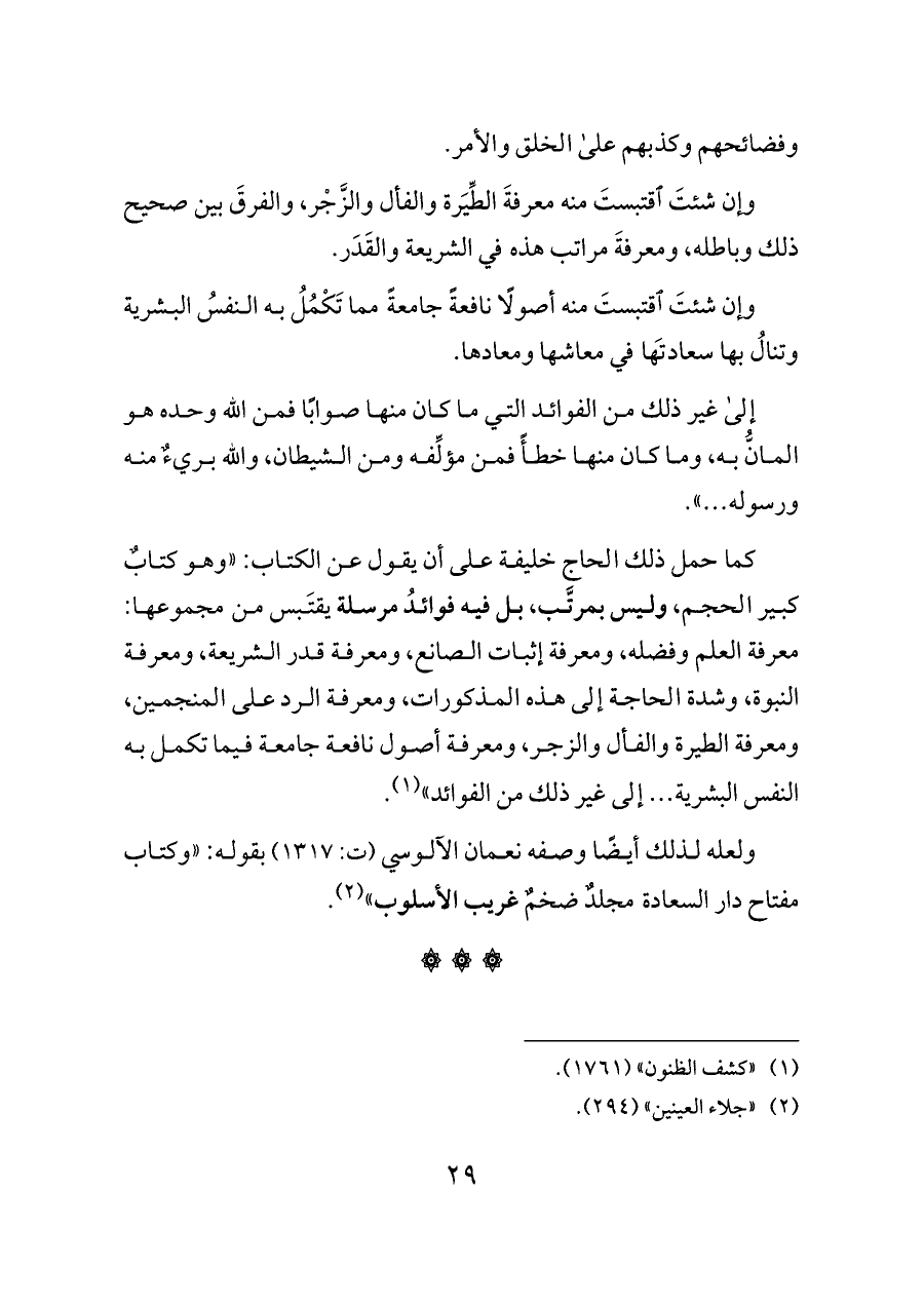 كما حمل ذلك الحاج خليفة على أن يقول عن الكتاب: "وهو كتابٌ كبير الحجم، وليس بمرتَّب، بل فيه فوائدُ مرسلة يقتَبس من مجموعها: معرفة العلم وفضله، ومعرفة إثبات الصانع، ومعرفة قدر الشريعة, ومعرفة النبوة, وشدة الحاجة إلى هذه المذكورات، ومعرفة الرد على المنجمين، ومعرفة الطيرة والفأل والزجر، ومعرفة أصول نافعة جامعة فيما تكمل به النفس البشرية ... إلى غير ذلك من الفوائد" (¬١).