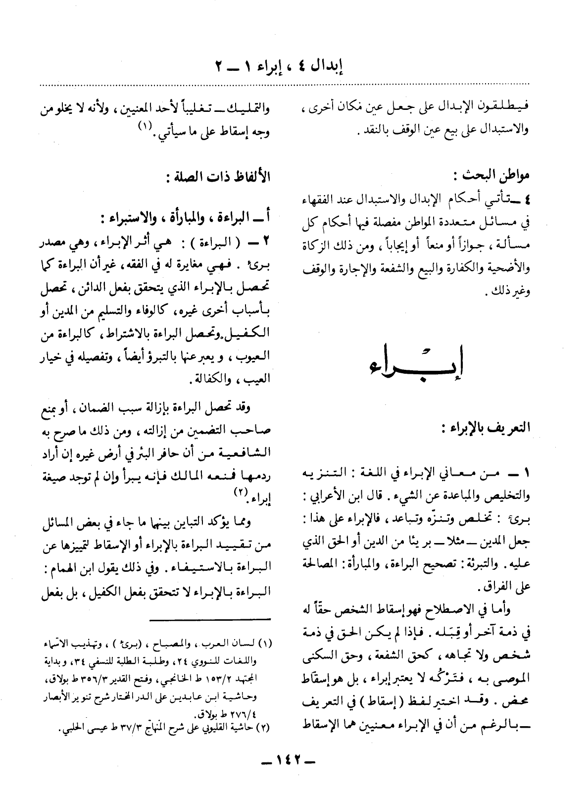 (1) لسان العرب، والمصباح، (برئ) ، وتهذيب الأسماء واللغات للنووي 24، وطلبة الطلبة للنسفي 34، وبداية المجتهد 2 / 153 ط الخانجي، وفتح القدير 3 / 356 ط بولاق، وحاشية ابن عابدين على الدر المختار شرح تنوير الأبصار 4 / 276 ط بولاق.