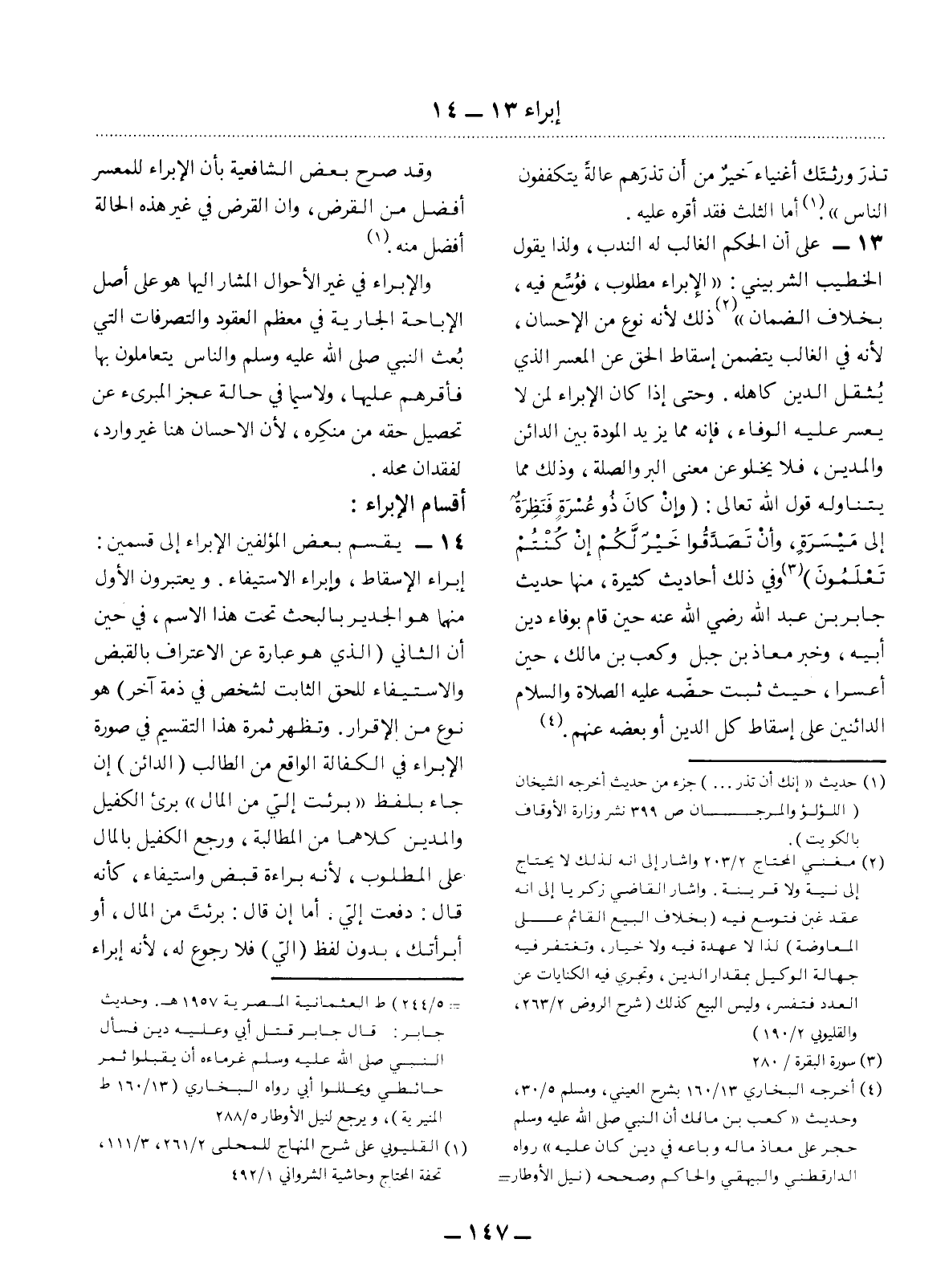 13 - عَلَى أَنَّ الْحُكْمَ الْغَالِبَ لَهُ النَّدْبُ، وَلِذَا يَقُول الْخَطِيبُ الشِّرْبِينِيُّ: " الإِْبْرَاءُ مَطْلُوبٌ، فَوُسِّعَ فِيهِ، بِخِلاَفِ الضَّمَانِ " (2) ذَلِكَ لأَِنَّهُ نَوْعٌ مِنَ الإِْحْسَانِ؛ لأَِنَّهُ فِي الْغَالِبِ يَتَضَمَّنُ إِسْقَاطَ الْحَقِّ عَنِ الْمُعْسِرِ الَّذِي يُثْقِل الدَّيْنُ كَاهِلَهُ. وَحَتَّى إِذَا كَانَ الإِْبْرَاءُ لِمَنْ لاَ يَعْسُرُ عَلَيْهِ الْوَفَاءُ، فَإِنَّهُ مِمَّا يَزِيدُ الْمَوَدَّةَ بَيْنَ الدَّائِنِ وَالْمَدِينِ، فَلاَ يَخْلُو عَنْ مَعْنَى الْبِرِّ وَالصِّلَةِ، وَذَلِكَ مِمَّا يَتَنَاوَلُهُ قَوْل اللَّهِ تَعَالَى: {وَإِنْ كَانَ ذُو عُسْرَةٍ فَنَظِرَةٌ إِلَى مَيْسَرَةٍ وَأَنْ تَصَدَّقُوا خَيْرٌ لَكُمْ إِنْ كُنْتُمْ تَعْلَمُونَ} (3) وَفِي ذَلِكَ أَحَادِيثُ كَثِيرَةٌ، مِنْهَا حَدِيثُ جَابِرِ بْنِ عَبْدِ اللَّهِ رَضِيَ اللَّهُ عَنْهُ حِينَ قَامَ بِوَفَاءِ دَيْنِ أَبِيهِ، وَخَبَرُ مُعَاذِ بْنِ جَبَلٍ وَكَعْبِ بْنِ مَالِكٍ، حِينَ أَعْسَرَا، حَيْثُ ثَبَتَ حَضُّهُ عَلَيْهِ الصَّلَاةُ وَالسَّلَامُ الدَّائِنِينَ عَلَى إِسْقَاطِ كُل الدَّيْنِ أَوْ بَعْضِهِ عَنْهُمْ (4) .