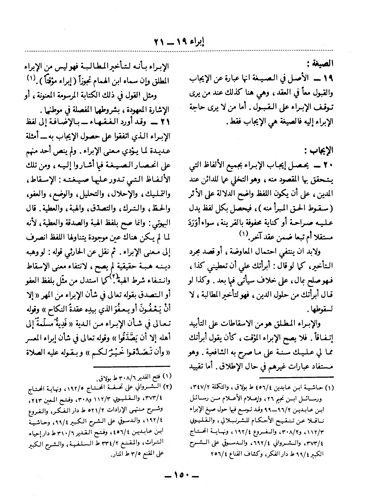 (1) حاشية ابن عابدين 4 / 456 ط بولاق، والتكملة 2 / 347، ورسائل ابن نجيم 26، وأعلام الأعلام من رسائل ابن عابدين 2 / 96 - 99 وقد توسع فيها حول صيغ الإبراء ناقلا عن تنقيح الأحكام للشرنبلالي، والقليوبي 3 / 112، و2 / 308، والفروع 4 / 192، ونهاية المحتاج 4 / 373، والشرواني 4 / 692، والدسوقي على الشرح الكبير 4 / 99 ط دار الفكر، وكشاف القناع 4 / 256