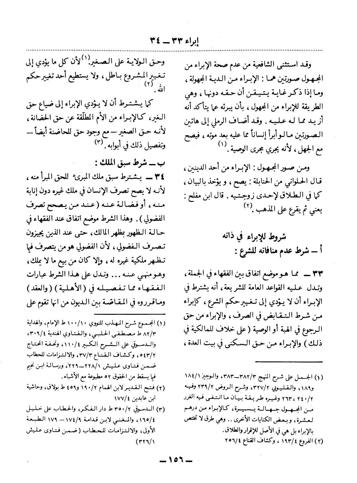 33 - مِمَّا هُوَ مَوْضِعُ اتِّفَاقٍ بَيْنَ الْفُقَهَاءِ فِي الْجُمْلَةِ، وَتَدُل عَلَيْهِ الْقَوَاعِدُ الْعَامَّةُ لِلشَّرِيعَةِ، أَنَّهُ يُشْتَرَطُ فِي الإِْبْرَاءِ أَنْ لاَ يُؤَدِّيَ إِلَى تَغْيِيرِ حُكْمِ الشَّرْعِ، كَإِبْرَاءِ مَنْ شَرَطَ التَّقَابُضَ فِي الصَّرْفِ، وَالإِْبْرَاءِ مِنْ حَقِّ الرُّجُوعِ فِي الْهِبَةِ أَوِ الْوَصِيَّةِ (عَلَى خِلاَفٍ لِلْمَالِكِيَّةِ فِي ذَلِكَ) وَالإِْبْرَاءِ مِنْ حَقِّ السُّكْنَى فِي بَيْتِ الْعِدَّةِ،