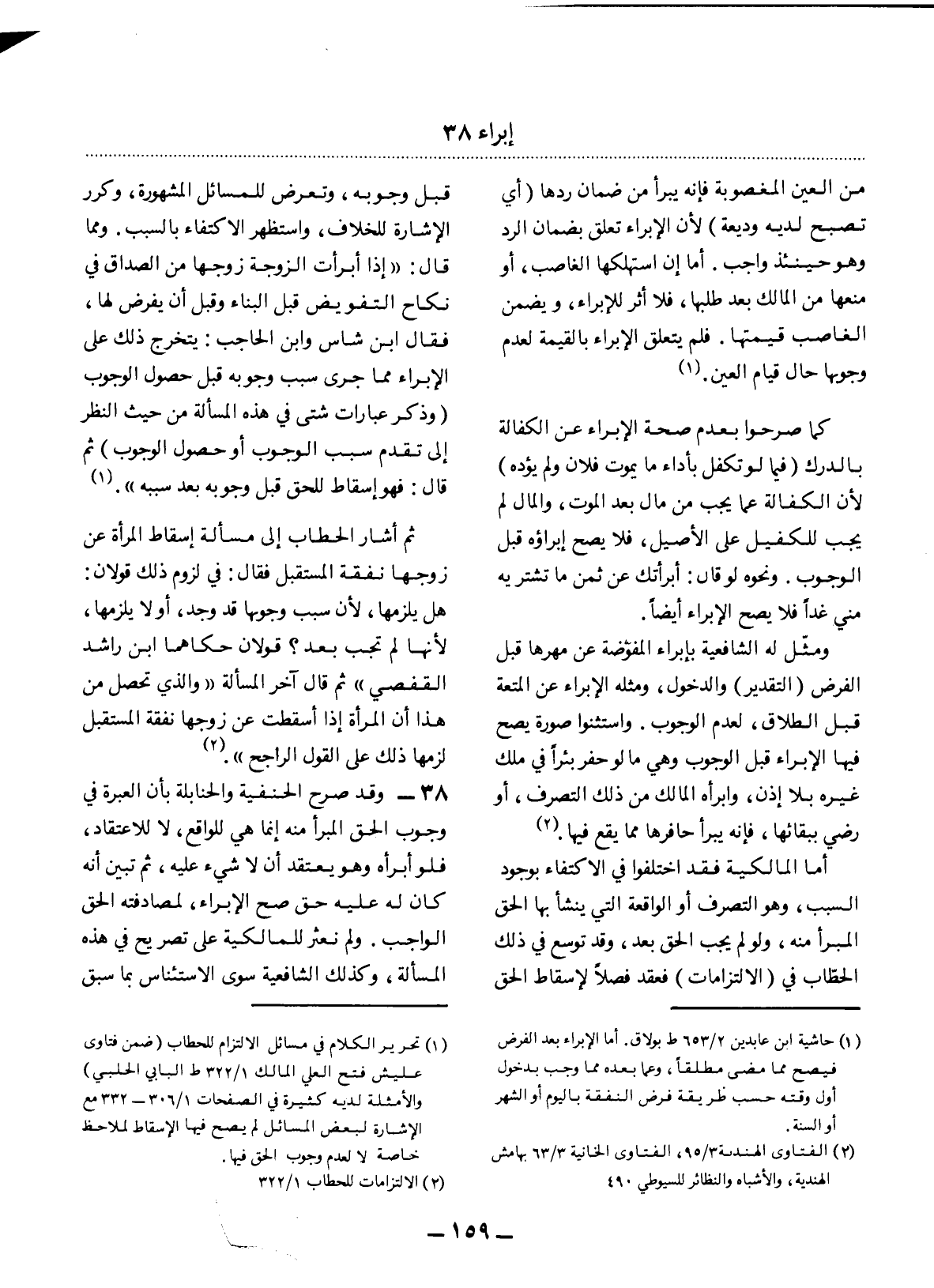 (1) تحرير الكلام في مسائل الالتزام للحطاب (ضمن فتاوى عليش فتح العلي المالك 1 / 322 ط البابي الحلبي) والأمثلة لديه كثيرة في الصفحات 1 / 306 - 332 مع الإشارة لبعض المسائل لم يصح فيها الإسقاط لملاحظ خاصة لا لعدم وجوب الحق فيها.