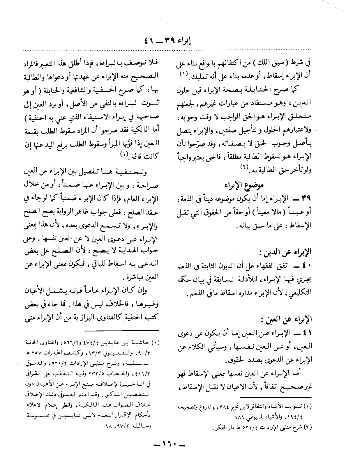 (1) حاشية ابن عابدين 4 / 474 و2 / 566، والفتاوى الخانية 3 / 90، والقليوبي 3 / 13، وكشف المخدرات 257 ط السلفية، وشرح منتهى الإرادات 2 / 521، والدسوقي 3 / 411، والحطاب 5 / 232 وفيه التعقب على القرافي في الذخيرة لإطلاقه منع الإبراء عن الأعيان دون التفصيل المذكور. وقد اعتبر الدسوقي ذلك الإطلاق خلاف الصواب عند المالكية، وإعلام الأعلام بأحكام الإقرار العام لابن عابدين في مجموعة رسائله 2 / 97، 98