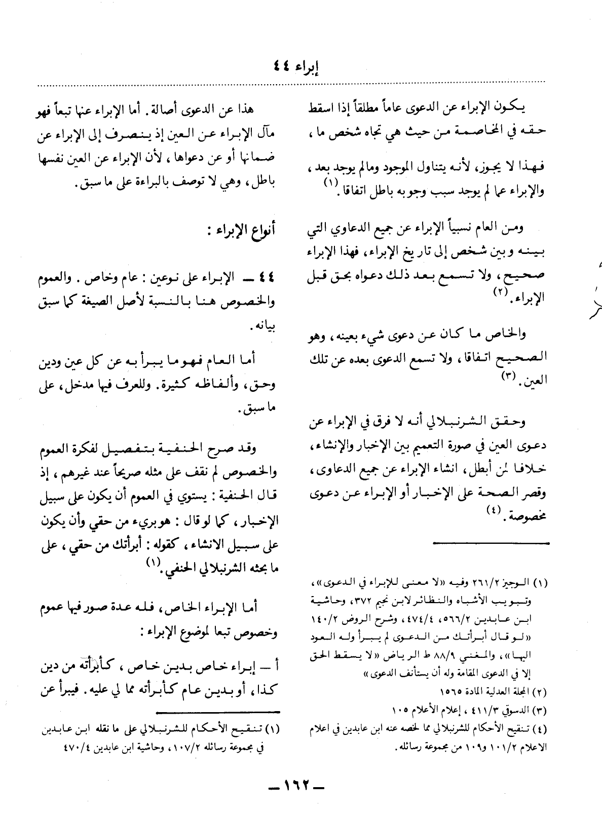 44 - الإِْبْرَاءُ عَلَى نَوْعَيْنِ: عَامٌّ وَخَاصٌّ. وَالْعُمُومُ وَالْخُصُوصُ هُنَا بِالنِّسْبَةِ لأَِصْل الصِّيغَةِ كَمَا سَبَقَ بَيَانُهُ.
