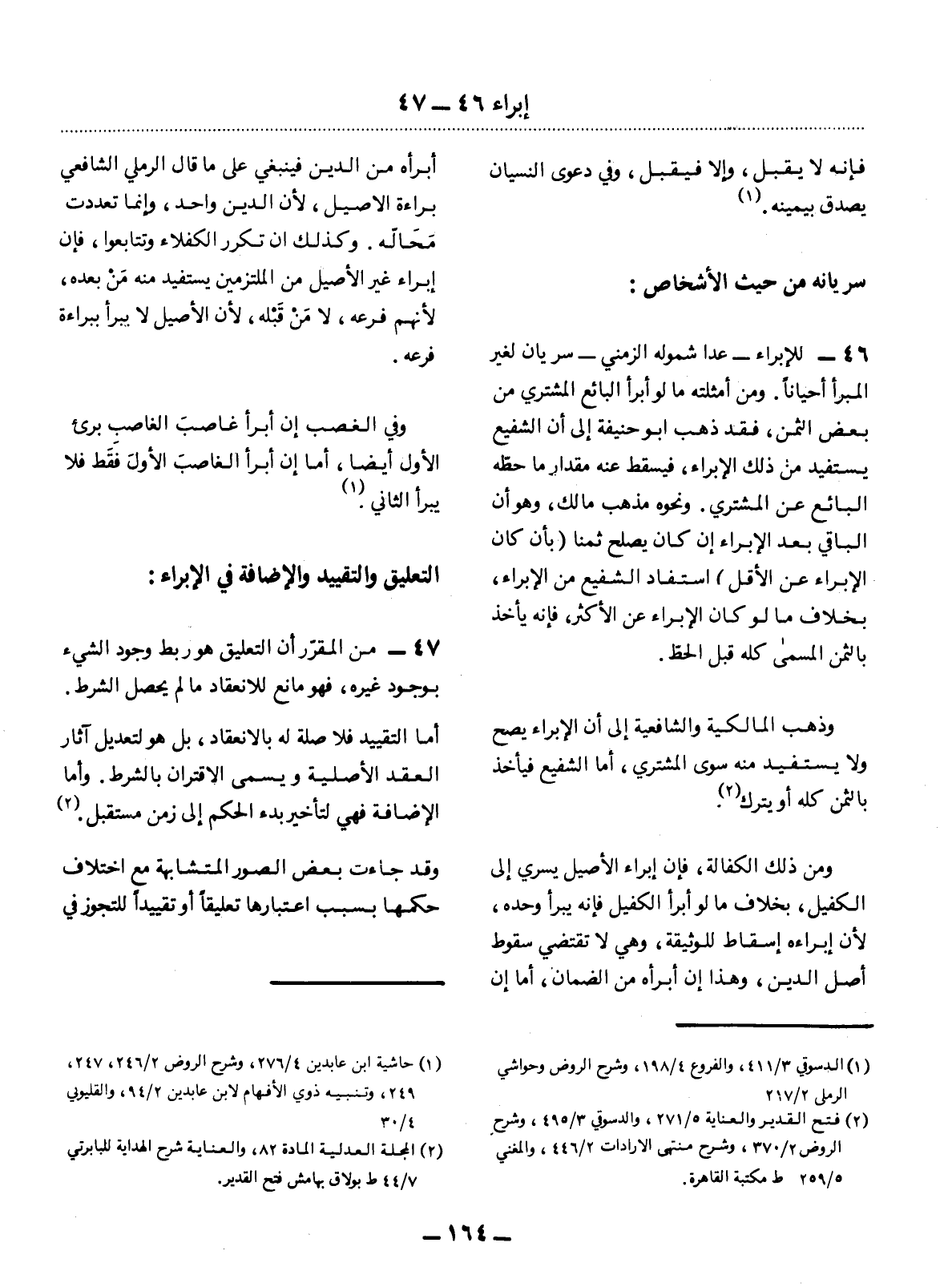 46 - لِلإِْبْرَاءِ - عَدَا شُمُولِهِ الزَّمَنِيِّ - سَرَيَانٌ لِغَيْرِ الْمُبْرَأِ أَحْيَانًا. وَمِنْ أَمْثِلَتِهِ مَا لَوْ أَبْرَأَ الْبَائِعُ الْمُشْتَرِيَ مِنْ بَعْضِ الثَّمَنِ، فَقَدْ ذَهَبَ أَبُو حَنِيفَةَ إِلَى أَنَّ الشَّفِيعَ يَسْتَفِيدُ مِنْ ذَلِكَ الإِْبْرَاءِ، فَيَسْقُطُ عَنْهُ مِقْدَارُ مَا حَطَّهُ الْبَائِعُ عَنِ الْمُشْتَرِي. وَنَحْوُهُ مَذْهَبُ مَالِكٍ، وَهُوَ أَنَّ الْبَاقِيَ بَعْدَ الإِْبْرَاءِ إِنْ كَانَ يَصْلُحُ ثَمَنًا (بِأَنْ كَانَ الإِْبْرَاءُ عَنِ الأَْقَل) اسْتَفَادَ الشَّفِيعُ مِنَ الإِْبْرَاءِ، بِخِلاَفِ مَا لَوْ كَانَ الإِْبْرَاءُ عَنِ الأَْكْثَرِ، فَإِنَّهُ يَأْخُذُ بِالثَّمَنِ الْمُسَمَّى كُلِّهِ قَبْل الْحَطِّ.