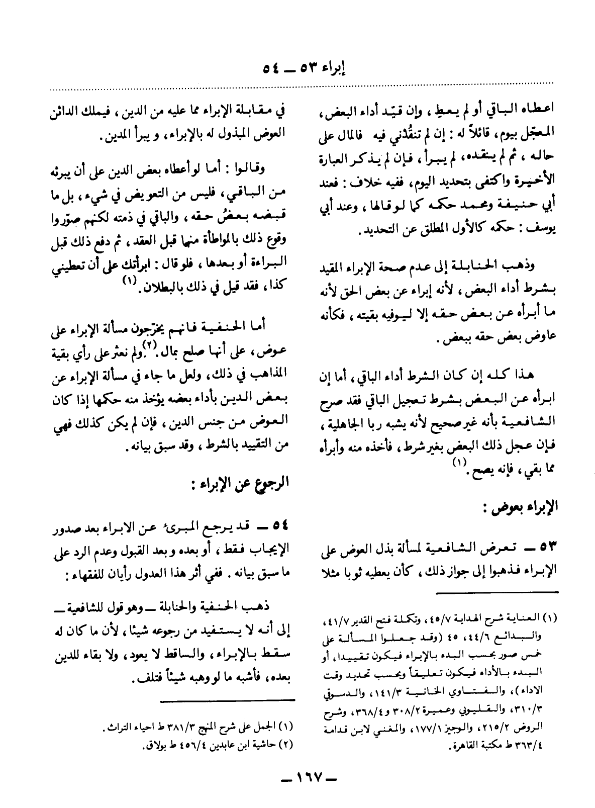 (1) العناية شرح الهداية 7 / 45، وتكملة فتح القدير 7 / 41، والبدائع 6 / 44، 45 (وقد جعلوا المسألة على خمس صور بحسب البدء بالإبراء فيكون تقييدا، أو البدء بالأداء فيكون تعليقا وبحسب تحديد وقت الأداء) ، والفتاوى الخانية 3 / 141، والدسوقي 3 / 310، والقليوبي وعميرة 4 / 368 و2 / 308، وشرح الروض 2 / 215، والوجيز 1 / 177، والمغني لابن قدامة 4 / 363 ط مكتبة القاهرة