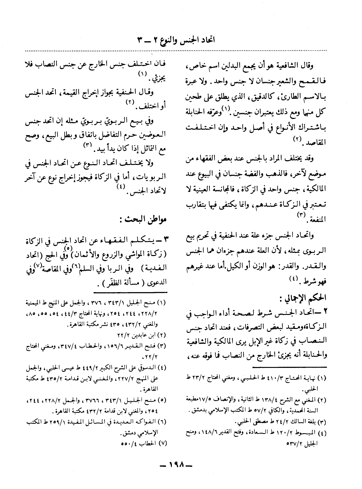 3 - يَتَكَلَّمُ الْفُقَهَاءُ عَنِ اتِّحَادِ الْجِنْسِ فِي الزَّكَاةِ (زَكَاةُ الْمَوَاشِي وَالزُّرُوعِ وَالأَْثْمَانِ (5)) وَفِي الْحَجِّ (اتِّحَادُ الْفِدْيَةِ) وَفِي الرِّبَا وَفِي السَّلَمِ (6) وَفِي الْمُقَاصَّةِ (7) وَفِي الدَّعْوَى (مَسْأَلَةُ الظُّفُرِ) .