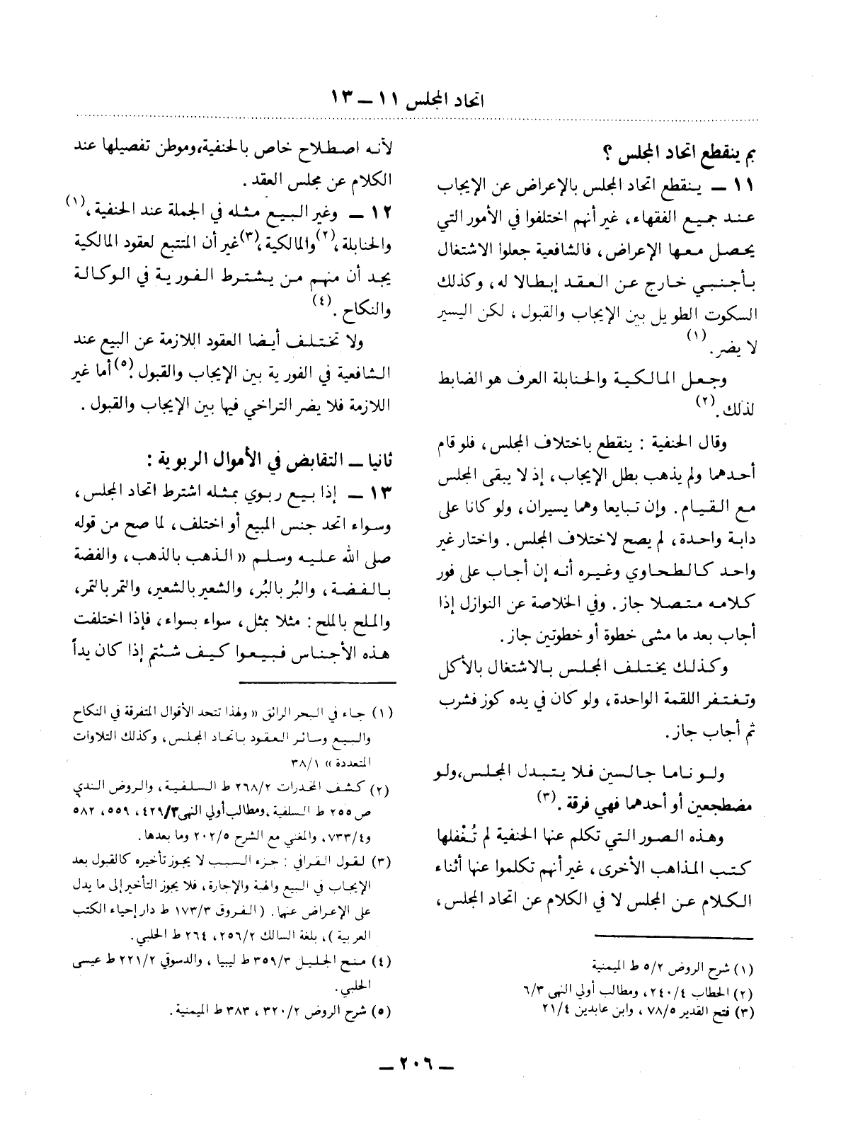 13 - إِذَا بِيعَ رِبَوِيٌّ بِمِثْلِهِ اشْتُرِطَ اتِّحَادُ الْمَجْلِسِ، وَسَوَاءٌ اتَّحَدَ جِنْسُ الْمَبِيعِ أَوِ اخْتَلَفَ، لِمَا صَحَّ مِنْ قَوْلِهِ صَلَّى اللَّهُ عَلَيْهِ وَسَلَّمَ الذَّهَبُ بِالذَّهَبِ، وَالْفِضَّةُ بِالْفِضَّةِ، وَالْبُرُّ بِالْبُرِّ، وَالشَّعِيرُ بِالشَّعِيرِ، وَالتَّمْرُ بِالتَّمْرِ، وَالْمِلْحُ بِالْمِلْحِ؛ مِثْلاً بِمِثْلٍ سَوَاءً بِسَوَاءٍ، فَإِذَا اخْتَلَفَتْ هَذِهِ الأَْجْنَاسُ فَبِيعُوا كَيْفَ شِئْتُمْ إِذَا كَانَ يَدًا