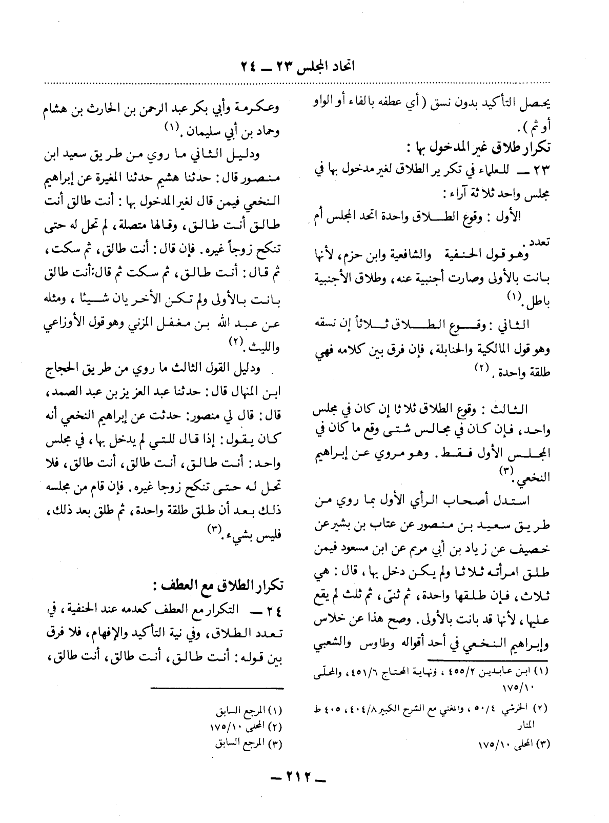 23 - لِلْعُلَمَاءِ فِي تَكْرِيرِ الطَّلاَقِ لِغَيْرِ مَدْخُولٍ بِهَا فِي مَجْلِسٍ وَاحِدٍ ثَلاَثَةُ آرَاءٍ: