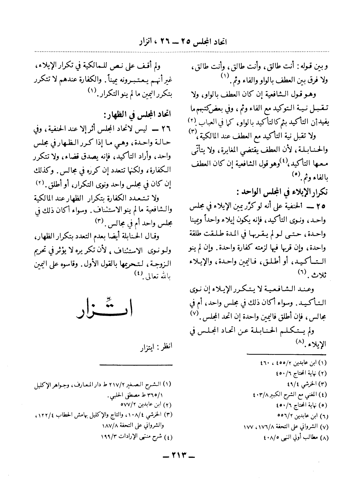 26 - لَيْسَ لاِتِّحَادِ الْمَجْلِسِ أَثَرٌ إِلاَّ عِنْدَ الْحَنَفِيَّةِ، وَفِي حَالَةٍ وَاحِدَةٍ، وَهِيَ مَا إِذَا كَرَّرَ الظِّهَارَ فِي مَجْلِسٍ وَاحِدٍ وَأَرَادَ التَّأْكِيدَ، فَإِنَّهُ يُصَدَّقُ قَضَاءً، وَلاَ تَتَكَرَّرُ الْكَفَّارَةُ، وَلَكِنَّهَا تَتَعَدَّدُ إِنْ كَرَّرَهُ فِي مَجَالِسَ. وَكَذَلِكَ إِنْ كَانَ فِي مَجْلِسٍ وَاحِدٍ وَنَوَى التَّكْرَارَ، أَوْ أَطْلَقَ (2) .