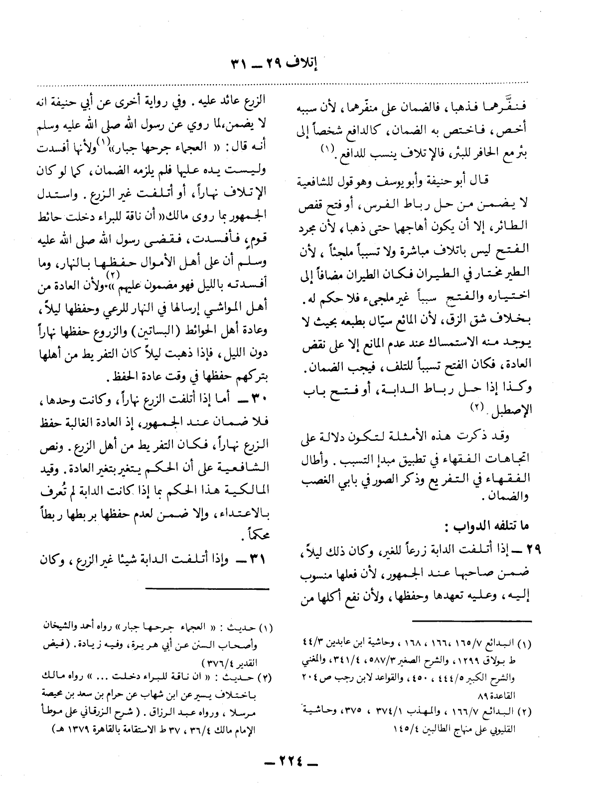 (1) حديث " العجماء جرحها جبار " رواه أحمد والشيخان وأصحاب السنن عن أبي هريرة، وفيه زيادة. (فيض القدير 4 / 376)