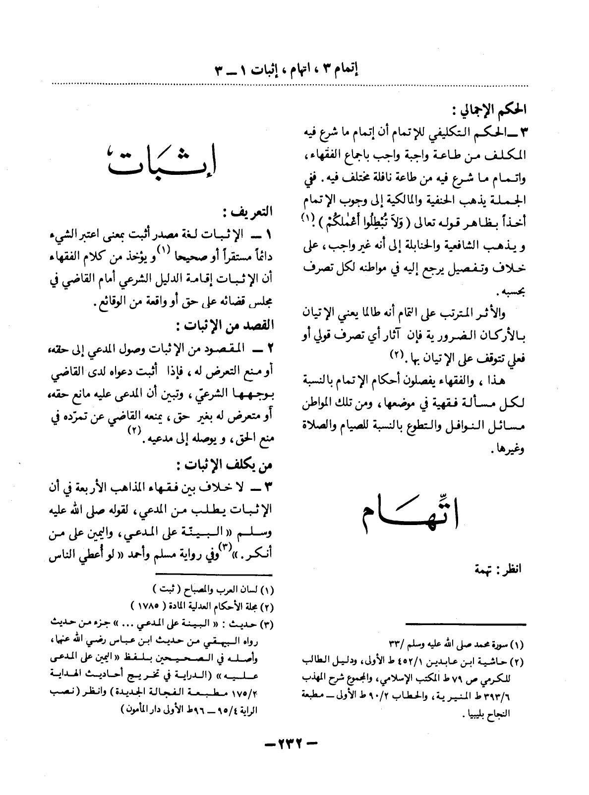 (3) حديث: " البينة على المدعي. . .) ، جزء من حديث رواه البيهقي من حديث ابن عباس رضي الله عنهما، وأصله في الصحيحين بلفظ " اليمين على المدعى عليه " (الدراية في تخريج أحاديث الهداية 2 / 175 مطبعة الفجالة الجديدة) وانظر (نصب الراية 4 / 95 - 96 ط الأولى دار المأمون) .