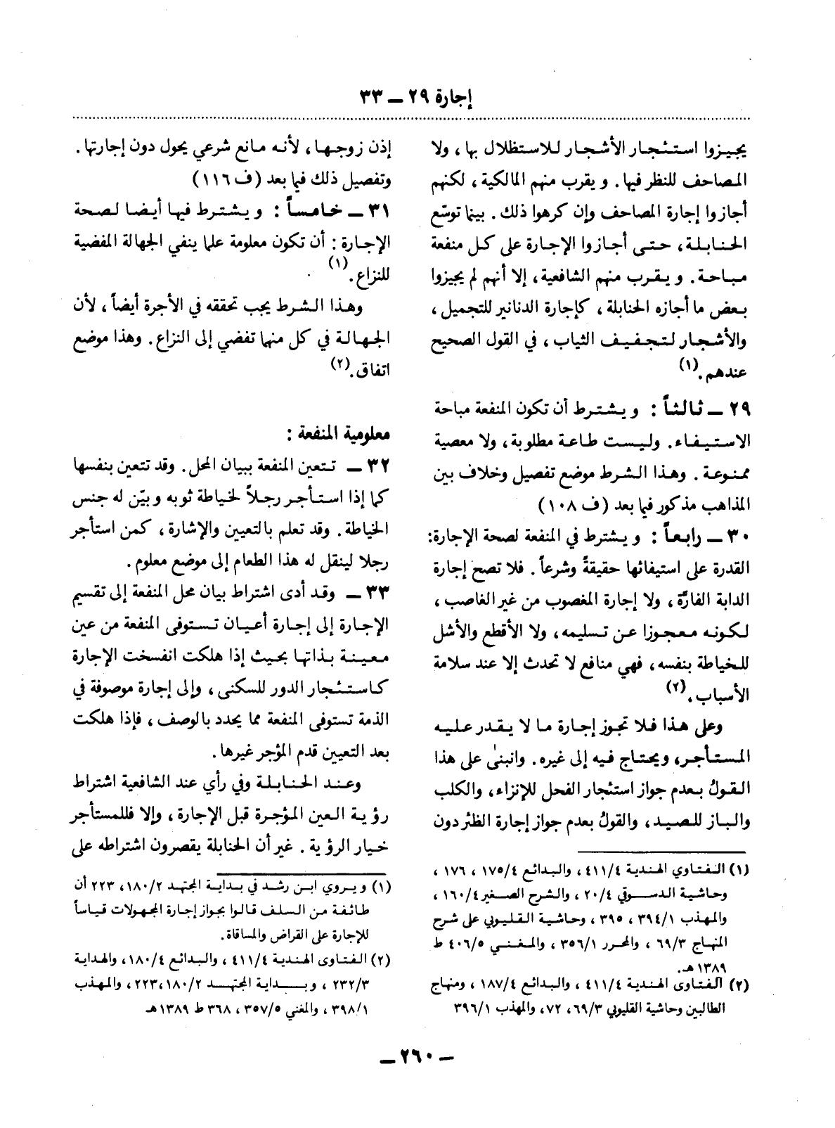 29 - ثَالِثًا وَيُشْتَرَطُ أَنْ تَكُونَ الْمَنْفَعَةُ مُبَاحَةَ الاِسْتِيفَاءِ. وَلَيْسَتْ طَاعَةً مَطْلُوبَةً، وَلاَ مَعْصِيَةً مَمْنُوعَةً. وَهَذَا الشَّرْطُ مَوْضِعُ تَفْصِيلٍ وَخِلاَفٍ بَيْنَ الْمَذَاهِبِ مَذْكُورٌ فِيمَا بَعْدُ (ف 108)