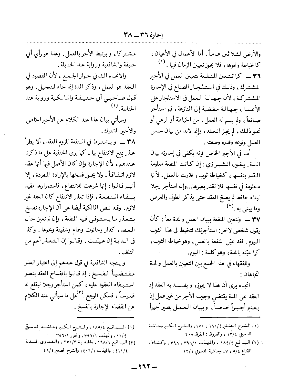 37 - وَتَتَعَيَّنُ الْمَنْفَعَةُ بِبَيَانِ الْعَمَل وَالْمُدَّةِ مَعًا: كَأَنْ يَقُول شَخْصٌ لآِخَرَ: اسْتَأْجَرْتُكَ لِتَخِيطَ لِي هَذَا الثَّوْبَ الْيَوْمَ. فَقَدْ عَيَّنَ الْمَنْفَعَةَ بِالْعَمَل، وَهُوَ خِيَاطَةُ الثَّوْبِ، كَمَا عَيَّنَهُ بِالْمُدَّةِ، وَهُوَ كَلِمَةُ: الْيَوْمَ.