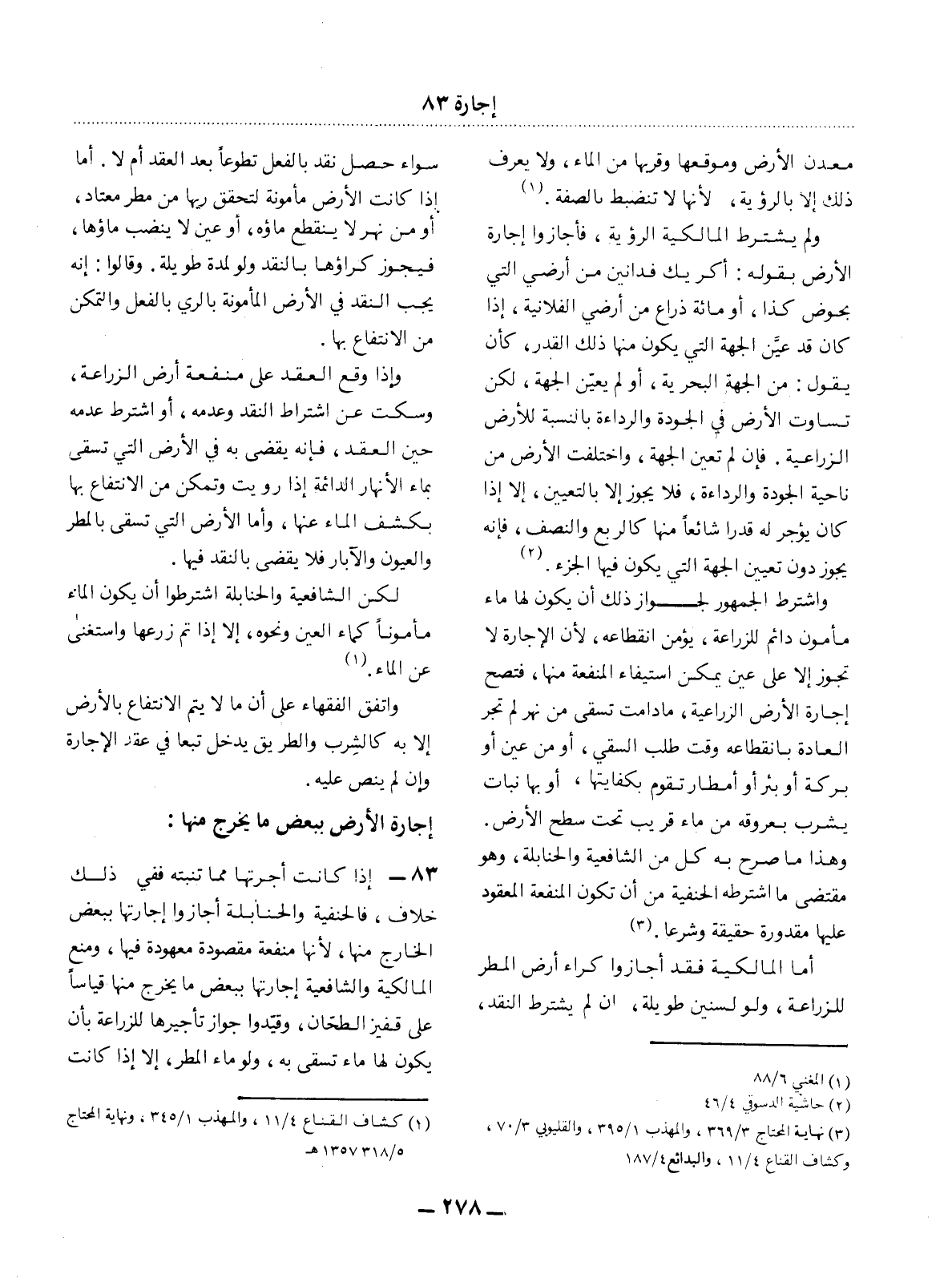 83 - إِذَا كَانَتْ أُجْرَتُهَا مِمَّا تُنْبِتُهُ فَفِي ذَلِكَ خِلاَفٌ، فَالْحَنَفِيَّةُ وَالْحَنَابِلَةُ أَجَازُوا إِجَارَتَهَا بِبَعْضِ الْخَارِجِ مِنْهَا؛ لأَِنَّهَا مَنْفَعَةٌ مَقْصُودَةٌ مَعْهُودَةٌ فِيهَا، وَمَنَعَ الْمَالِكِيَّةُ وَالشَّافِعِيَّةُ إِجَارَتَهَا بِبَعْضِ مَا يَخْرُجُ مِنْهَا قِيَاسًا عَلَى قَفِيزِ الطَّحَّانِ، وَقَيَّدُوا جَوَازَ تَأْجِيرِهَا لِلزِّرَاعَةِ بِأَنْ يَكُونَ لَهَا مَاءٌ تُسْقَى بِهِ، وَلَوْ مَاءُ الْمَطَرِ، إِلاَّ إِذَا كَانَتْ