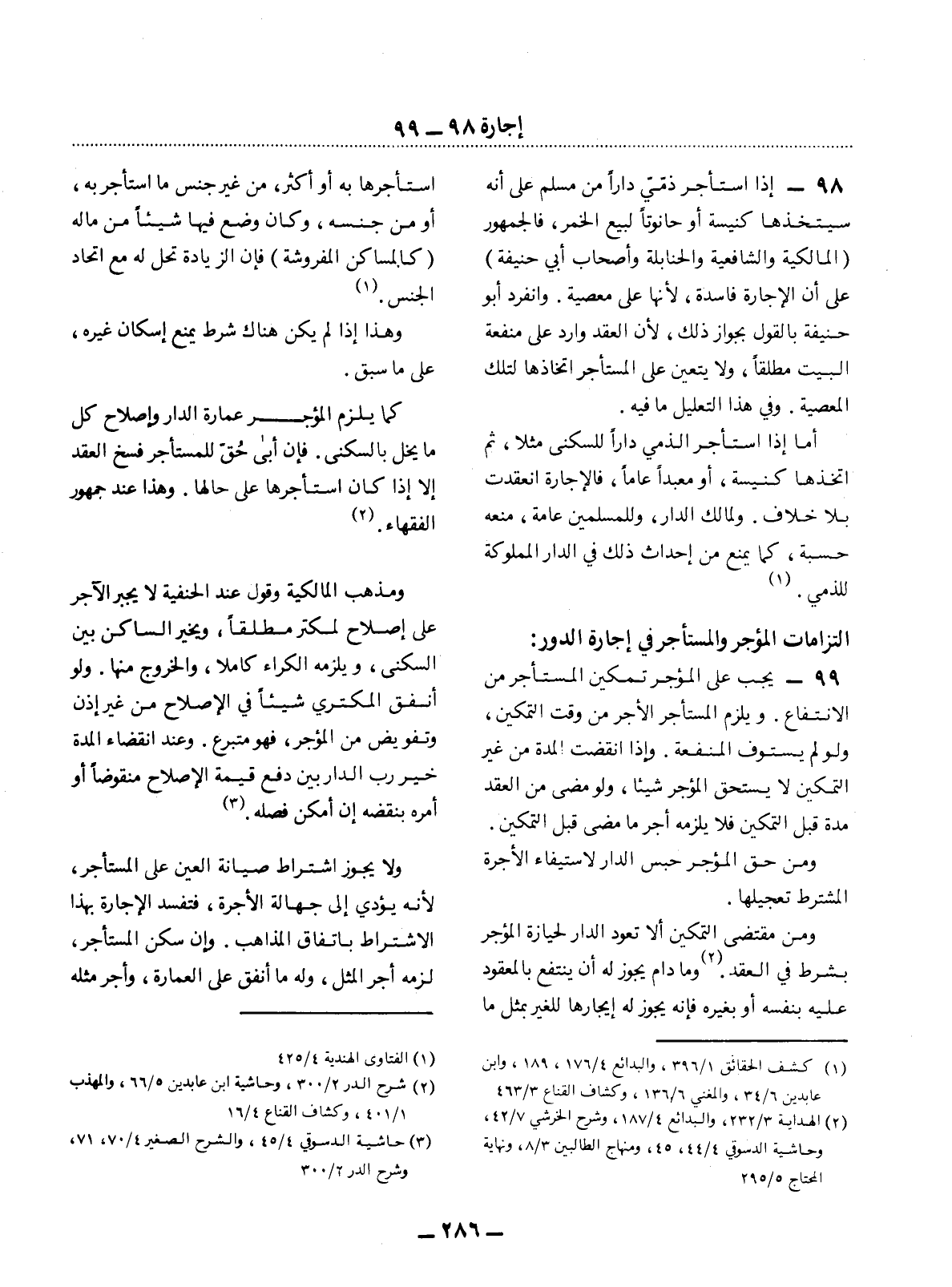98 - إِذَا اسْتَأْجَرَ ذِمِّيٌّ دَارًا مِنْ مُسْلِمٍ عَلَى أَنَّهُ سَيَتَّخِذُهَا كَنِيسَةً أَوْ حَانُوتًا لِبَيْعِ الْخَمْرِ، فَالْجُمْهُورُ (الْمَالِكِيَّةُ وَالشَّافِعِيَّةُ وَالْحَنَابِلَةُ وَأَصْحَابُ أَبِي حَنِيفَةَ) عَلَى أَنَّ الإِْجَارَةَ فَاسِدَةٌ؛ لأَِنَّهَا عَلَى مَعْصِيَةٍ. وَانْفَرَدَ أَبُو حَنِيفَةَ بِالْقَوْل بِجَوَازِ ذَلِكَ؛ لأَِنَّ الْعَقْدَ وَارِدٌ عَلَى مَنْفَعَةِ الْبَيْتِ مُطْلَقًا، وَلاَ يَتَعَيَّنُ عَلَى الْمُسْتَأْجِرِ اتِّخَاذُهَا لِتِلْكَ الْمَعْصِيَةِ. وَفِي هَذَا التَّعْلِيل مَا فِيهِ.