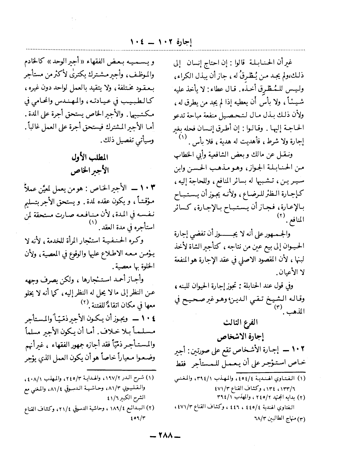 102 - إِجَارَةُ الأَْشْخَاصِ تَقَعُ عَلَى صُورَتَيْنِ: أَجِيرٌ خَاصٌّ اسْتُؤْجِرَ عَلَى أَنْ يَعْمَل لِلْمُسْتَأْجِرِ فَقَطْ