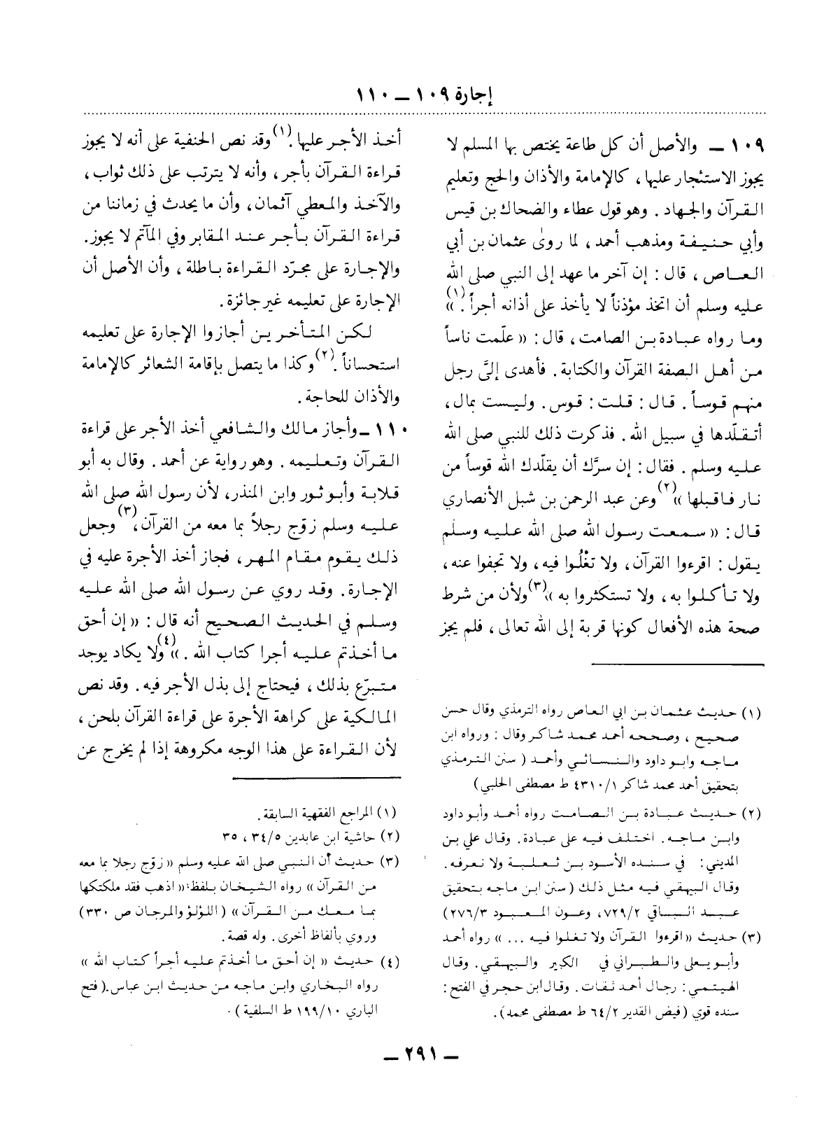 (4) حديث " إن أحق ما أخذتم عليه أجرا كتاب الله " رواه البخاري وابن ماجه من حديث ابن عباس. (فتح الباري 10 / 199 ط السلفية) .