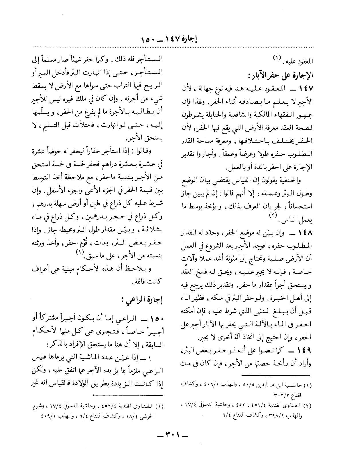 148 - وَإِنْ بَيَّنَ لَهُ مَوْضِعَ الْحَفْرِ، وَحَدَّدَ لَهُ الْمِقْدَارَ الْمَطْلُوبَ حَفْرُهُ، فَوَجَدَ الأَْجِيرُ بَعْدَ الشُّرُوعِ فِي الْعَمَل أَنَّ الأَْرْضَ صُلْبَةٌ وَتَحْتَاجُ إِلَى مَئُونَةٍ أَشَدَّ عَمَلاً وَآلاَتٍ خَاصَّةٍ، فَإِنَّهُ لاَ يُجْبَرُ عَلَيْهِ، وَيَحِقُّ لَهُ فَسْخُ الْعَقْدِ وَيَسْتَحِقُّ أَجْرًا بِمِقْدَارِ مَا حَفَرَ. وَتَقْدِيرُ ذَلِكَ يُرْجَعُ فِيهِ إِلَى أَهْل الْخِبْرَةِ. وَلَوْ حَفَرَ الْبِئْرَ فِي مِلْكِهِ، فَظَهَرَ الْمَاءُ قَبْل أَنْ يَبْلُغَ الْمُنْتَهَى الَّذِي شَرَطَ عَلَيْهِ، فَإِنْ أَمْكَنَهُ الْحَفْرُ فِي الْمَاءِ بِالآْلَةِ الَّتِي يَحْفِرُ بِهَا الآْبَارَ أُجْبِرَ عَلَى الْحَفْرِ، وَإِنِ احْتِيجَ إِلَى اتِّخَاذِ آلَةٍ أُخْرَى لاَ يُجْبَرُ.