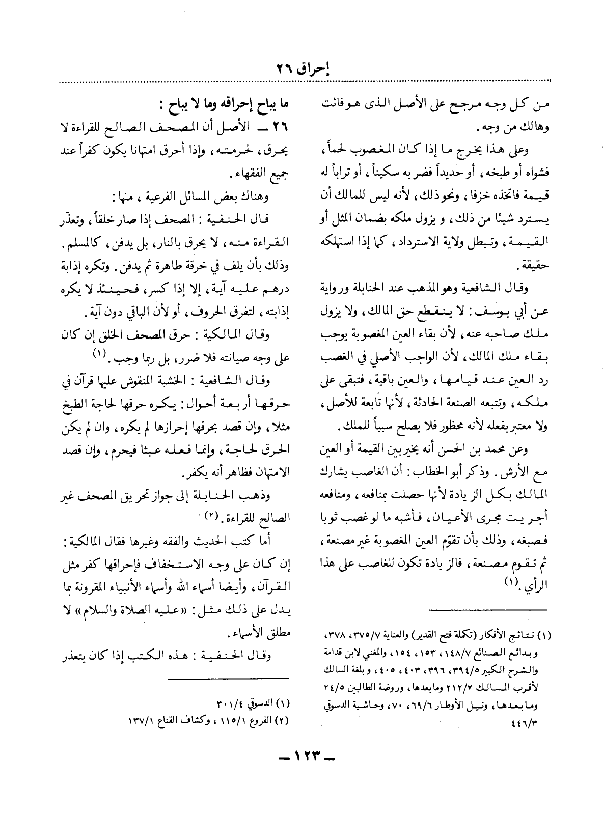 26 - الأَْصْل أَنَّ الْمُصْحَفَ الصَّالِحَ لِلْقِرَاءَةِ لاَ يُحْرَقُ، لِحُرْمَتِهِ، وَإِذَا أُحْرِقَ امْتِهَانًا يَكُونُ كُفْرًا عِنْدَ جَمِيعِ الْفُقَهَاءِ.
