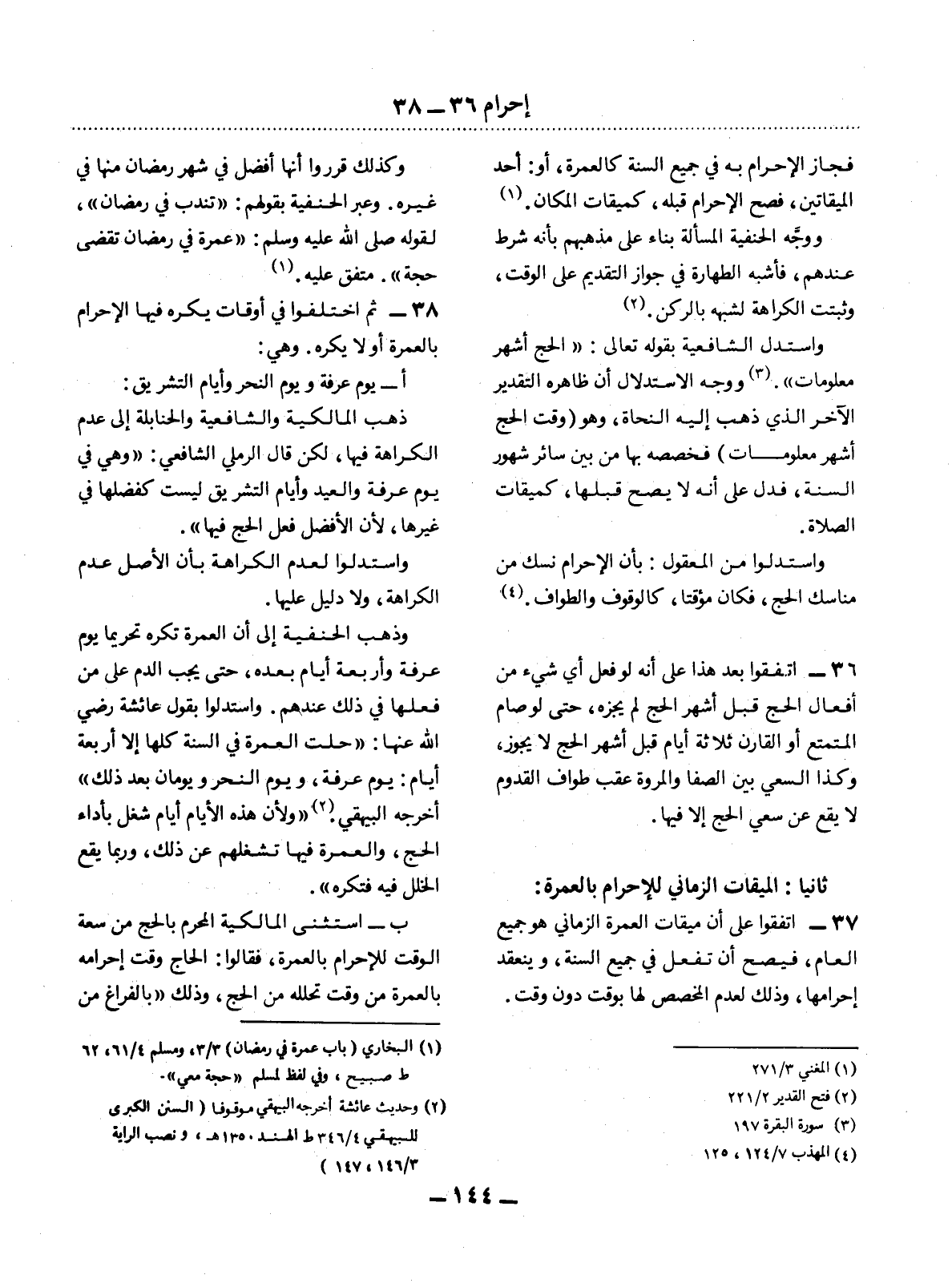 37 - اتَّفَقُوا عَلَى أَنَّ مِيقَاتَ الْعُمْرَةِ الزَّمَانِيَّ هُوَ جَمِيعُ الْعَامِ، فَيَصِحُّ أَنْ تُفْعَل فِي جَمِيعِ السَّنَةِ، وَيَنْعَقِدُ إِحْرَامُهَا، وَذَلِكَ لِعَدَمِ الْمُخَصِّصِ لَهَا بِوَقْتٍ دُونَ وَقْتٍ.
