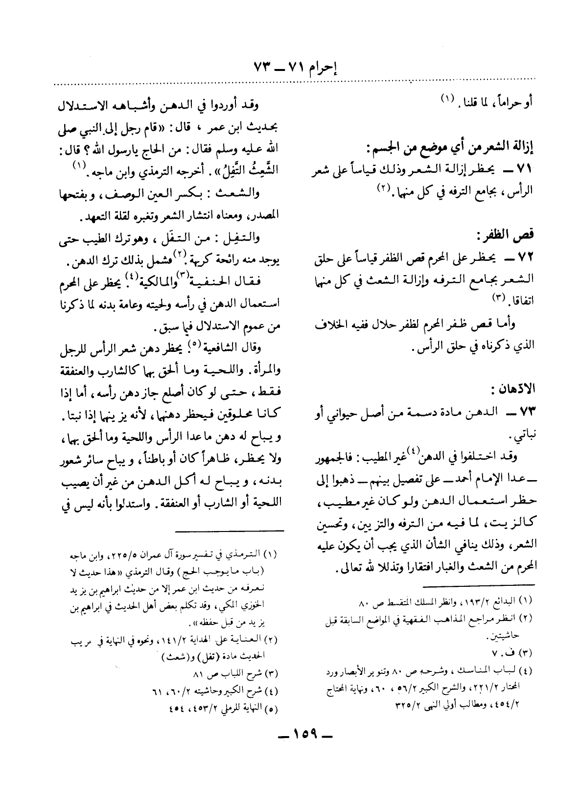 71 - يُحْظَرُ إِزَالَةُ الشَّعْرِ وَذَلِكَ قِيَاسًا عَلَى شَعْرِ الرَّأْسِ، بِجَامِعِ التَّرَفُّهِ فِي كُلٍّ مِنْهُمَا (2) .