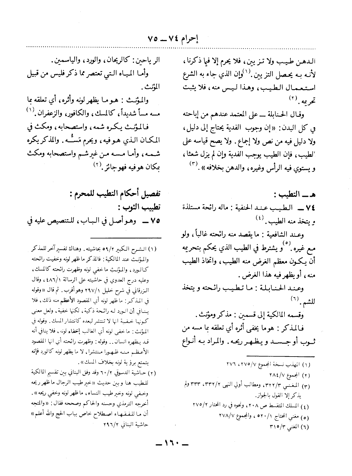 (2) حاشية الدسوقي 2 / 60 وقد وفق البناني بين تقسيم المالكية للطيب هنا وبين حديث: " خير طيب الرجال ما ظهر ريحه وخفي لونه وخير طيب النساء، ما ظهر لونه وخفي ريحه ". أخرجه الترمذي وحسنه، والحاكم وصححه فقال: " والمتجه أن ما للفقهاء اصطلاح خاص بباب الحج والله أعلم " حاشية البناني 2 / 296.