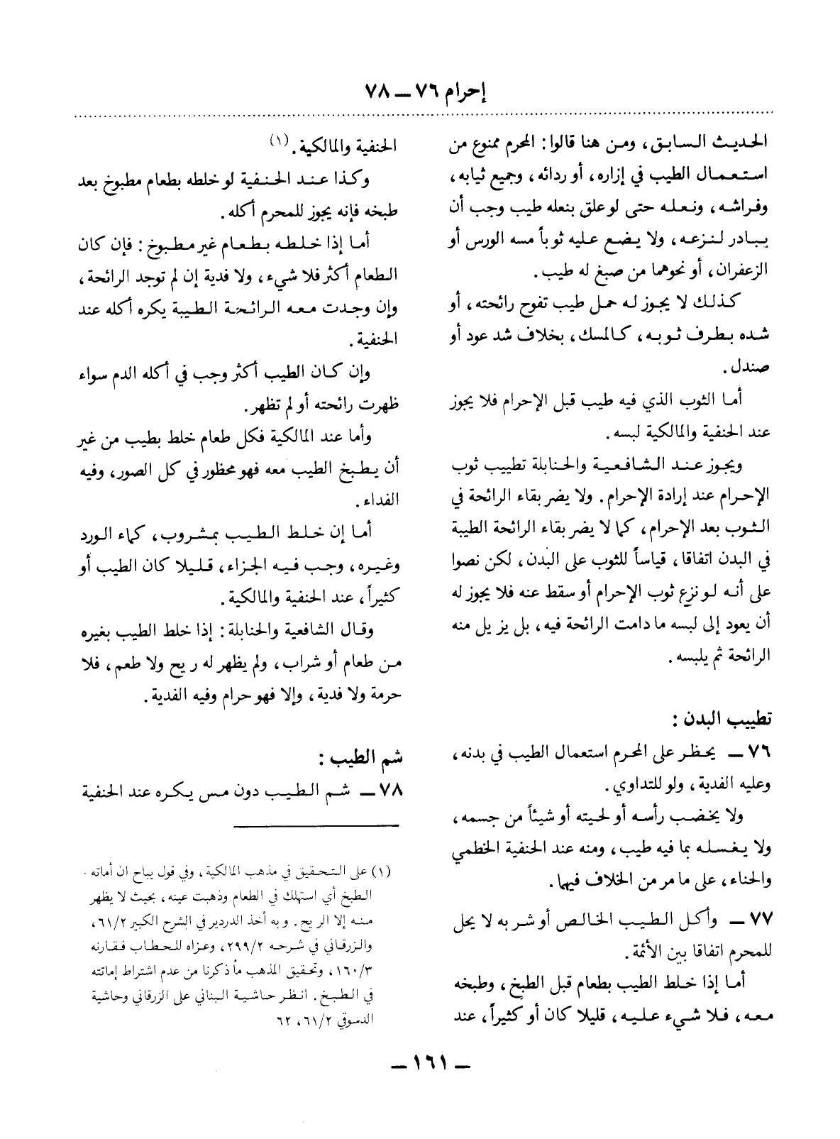 76 - يُحْظَرُ عَلَى الْمُحْرِمِ اسْتِعْمَال الطِّيبِ فِي بَدَنِهِ، وَعَلَيْهِ الْفِدْيَةُ، وَلَوْ لِلتَّدَاوِي.