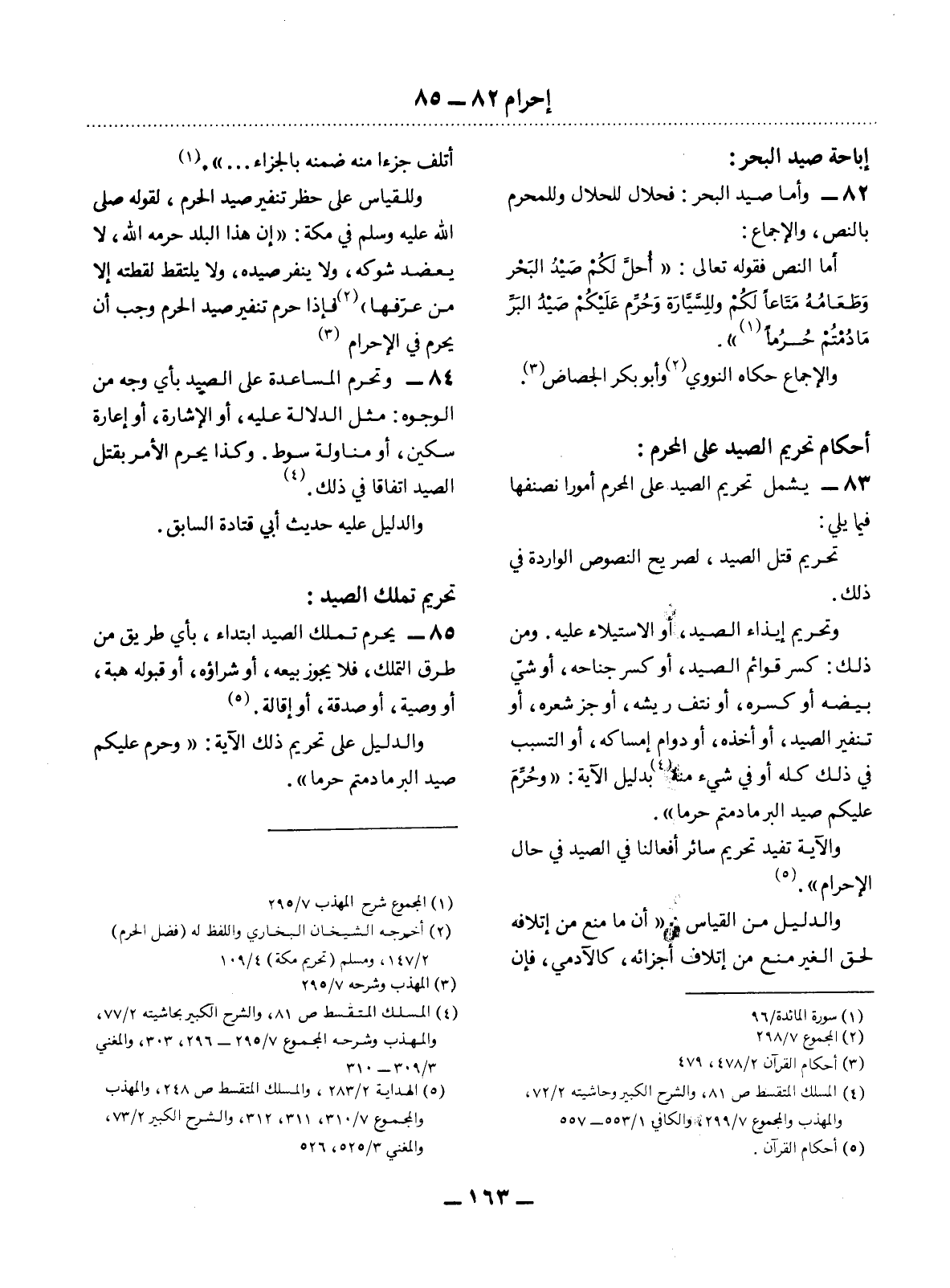 82 - وَأَمَّا صَيْدُ الْبَحْرِ: فَحَلاَلٌ لِلْحَلاَل وَلِلْمُحْرِمِ بِالنَّصِّ، وَالإِْجْمَاعِ: أَمَّا النَّصُّ فَقَوْلُهُ تَعَالَى: {أُحِل لَكُمْ صَيْدُ الْبَحْرِ وَطَعَامُهُ مَتَاعًا لَكُمْ وَلِلسَّيَّارَةِ وَحُرِّمَ عَلَيْكُمْ صَيْدُ الْبَرِّ مَا دُمْتُمْ حُرُمًا} (1) . وَالإِْجْمَاعُ حَكَاهُ النَّوَوِيُّ (2) وَأَبُو بَكْرٍ الْجَصَّاصُ (3) .
