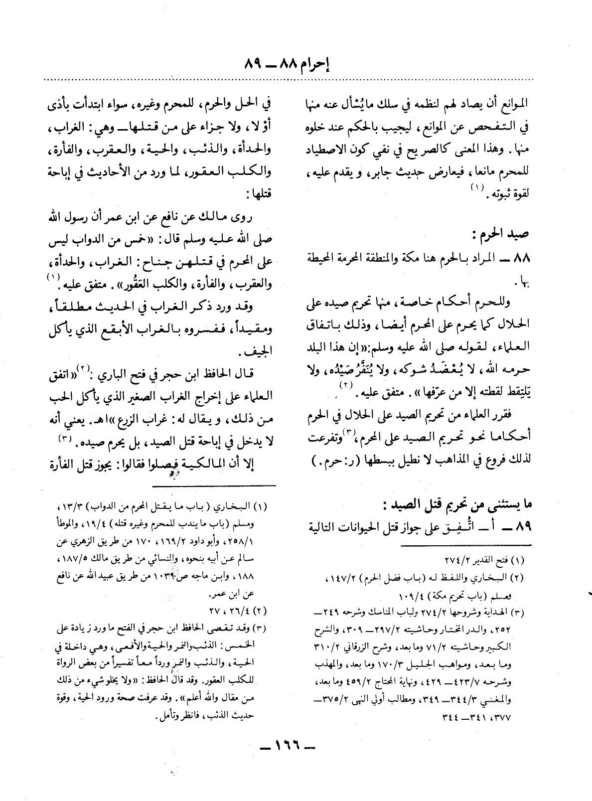 88 - الْمُرَادُ بِالْحَرَمِ هُنَا مَكَّةُ وَالْمِنْطَقَةُ الْمُحَرَّمَةُ الْمُحِيطَةُ بِهَا. وَلِلْحَرَمِ أَحْكَامٌ خَاصَّةٌ، مِنْهَا تَحْرِيمُ صَيْدِهِ عَلَى الْحَلاَل كَمَا يَحْرُمُ عَلَى الْمُحْرِمِ أَيْضًا، وَذَلِكَ بِاتِّفَاقِ الْعُلَمَاءِ، لِقَوْلِهِ صَلَّى اللَّهُ عَلَيْهِ وَسَلَّمَ: إِنَّ هَذَا الْبَلَدَ حَرَّمَهُ اللَّهُ، لاَ يُعْضَدُ شَوْكُهُ، وَلاَ يُنَفَّرُ صَيْدُهُ، وَلاَ تُلْتَقَطُ لُقَطَتُهُ إِلاَّ مَنْ عَرَّفَهَا. مُتَّفَقٌ عَلَيْهِ (2) . فَقَرَّرَ الْعُلَمَاءُ مِنْ تَحْرِيمِ الصَّيْدِ عَلَى الْحَلاَل فِي الْحَرَمِ أَحْكَامًا نَحْوَ تَحْرِيمِ الصَّيْدِ عَلَى الْمُحْرِمِ (3) ، وَتَفَرَّعَتْ لِذَلِكَ فُرُوعٌ فِي الْمَذَاهِبِ لاَ نُطِيل بِبَسْطِهَا (ر: حَرَمٌ.)