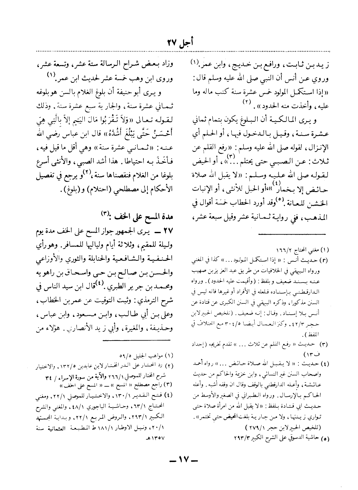 زَيْدُ بْنُ ثَابِتٍ، وَرَافِعُ بْنُ خَدِيجٍ، وَابْنُ عُمَرَ (1) . وَرُوِيَ عَنْ أَنَسٍ أَنَّ النَّبِيَّ صَلَّى اللَّهُ عَلَيْهِ وَسَلَّمَ قَال: إِذَا اسْتَكْمَل الْمَوْلُودُ خَمْسَ عَشْرَةَ سَنَةً كُتِبَ مَا لَهُ وَمَا عَلَيْهِ، وَأُخِذَتْ مِنْهُ الْحُدُودُ (2) .