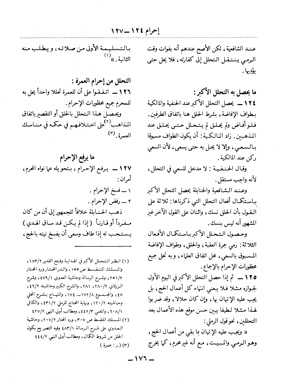 (1) انظر التحلل الأكبر في الهداية وفتح القدير 2 / 183، والمسلك المتقسط ص 155، والدر المختار ورد المحتار 2 / 251، وشرح الرسالة وحاشية العدوي 1 / 479، وشرح الزرقاني 2 / 280، 281، والشرح الكبير وحاشيته 2 / 46، 47، والمجموع 8 / 172 - 174، والمنهاج بشرح المحلي وحاشيته 2 / 120، ونهاية المحتاج للرملي 2 / 431، والكافي 1 / 608، والمغني 3 / 442، ومطالب أولي النهى 2 / 427