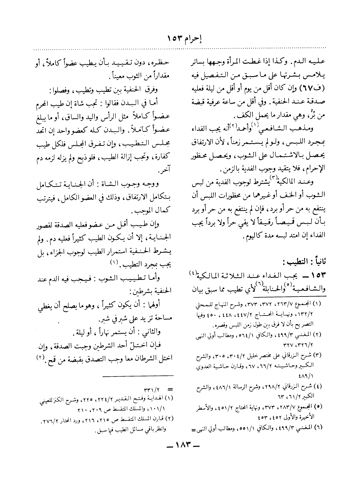 153 - يَجِبُ الْفِدَاءُ عِنْدَ الثَّلاَثَةِ الْمَالِكِيَّةِ (4) وَالشَّافِعِيَّةِ (5) وَالْحَنَابِلَةِ (6) لأَِيِّ تَطَيُّبٍ مِمَّا سَبَقَ بَيَانُ