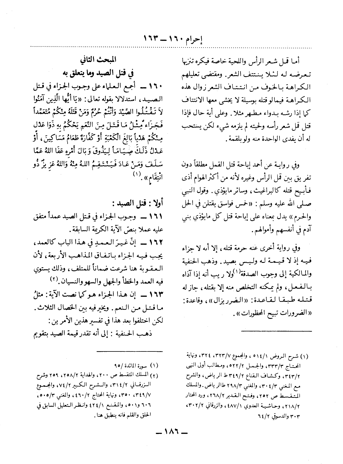 (2) المسلك المتقسط ص 200، والهداية 2 / 258، 259 وشرح الزرقاني 2 / 314، والشرح الكبير 2 / 74 والمجموع 7 / 349، 350، ونهاية المحتاج 2 / 460. والمغني 3 / 505، 606 و 501، والمقنع 1 / 424 وانظر التعليل السابق في الحلق والقلم فإنه ينطبق هنا.