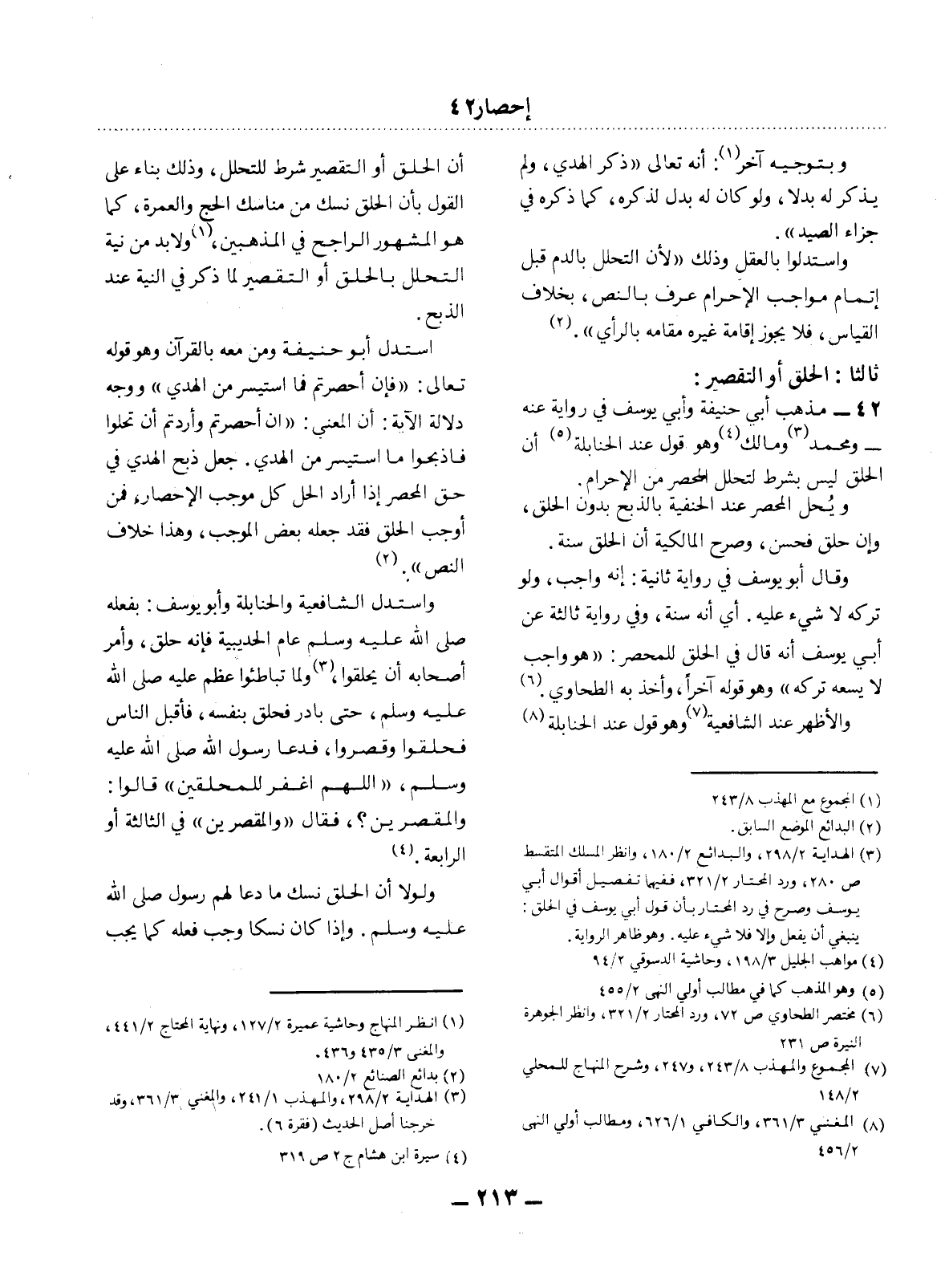 (3) الهداية 2 / 298، والبدائع 2 / 180، وانظر المسلك المتقسط ص 280، ورد المحتار 2 / 321، ففيهما تفصيل أقوال أبي يوسف وصرح في رد المحتار بأن قول أبي يوسف في الحلق: ينبغي أن يفعل وإلا فلا شيء عليه. وهو ظاهر الرواية.