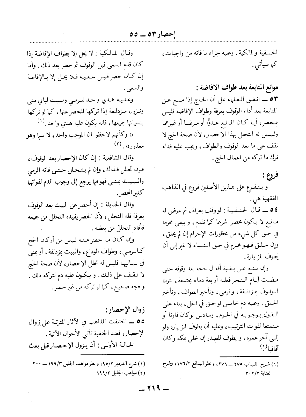 53 - اتَّفَقَ الْعُلَمَاءُ عَلَى أَنَّ الْحَاجَّ إِذَا مُنِعَ عَنِ الْمُتَابَعَةِ بَعْدَ أَدَاءِ الْوُقُوفِ بِعَرَفَةَ وَطَوَافِ الإِْفَاضَةِ فَلَيْسَ بِمُحْصَرٍ، أَيًّا كَانَ الْمَانِعُ عَدُوًّا أَوْ مَرَضًا أَوْ غَيْرَهُمَا وَلَيْسَ لَهُ التَّحَلُّل بِهَذَا الإِْحْصَارِ؛ لأَِنَّ صِحَّةَ الْحَجِّ لاَ تَقِفُ عَلَى مَا بَعْدَ الْوُقُوفِ وَالطَّوَافِ، وَيَجِبُ عَلَيْهِ فِدَاءُ تَرْكِ مَا تَرَكَهُ مِنْ أَعْمَال الْحَجِّ.