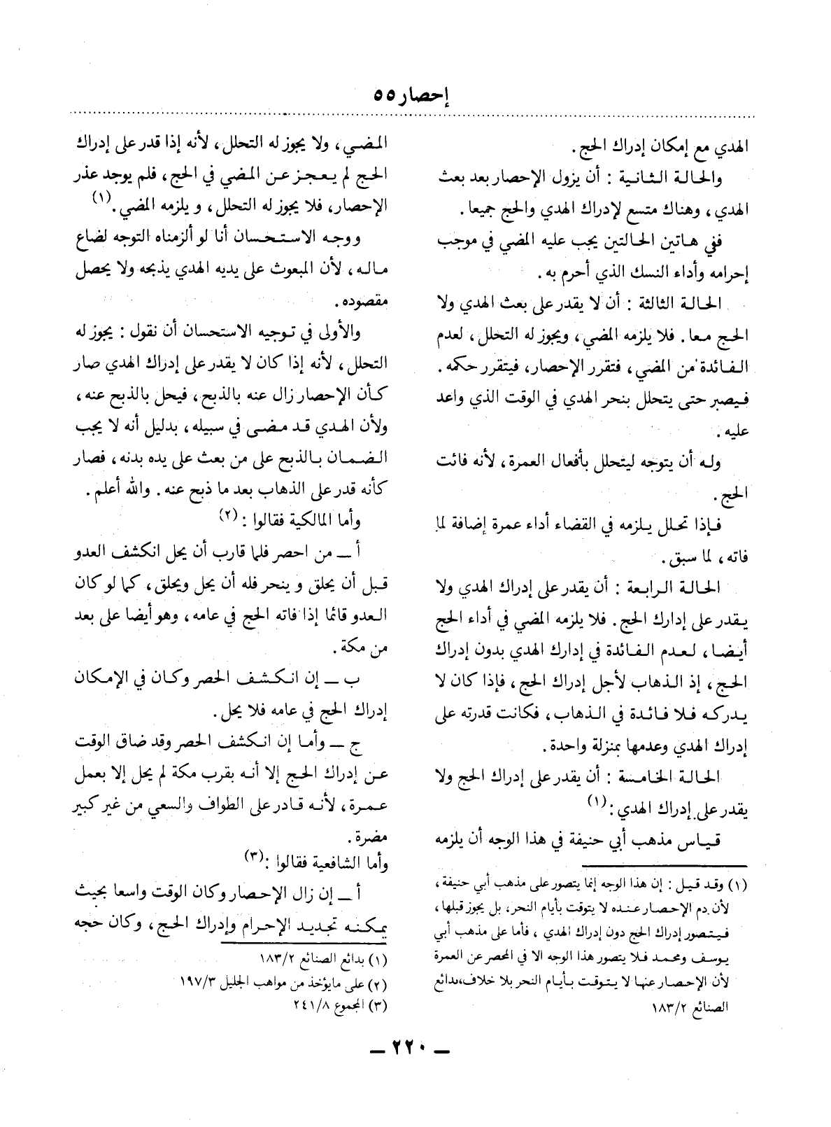 (1) وقد قيل: إن هذا الوجه إنما يتصور على مذهب أبي حنيفة، لأن دم الإحصار عنده لا يتوقت بأيام النحر، بل يجور قبلها، فيتصور إدراك الحج دون إدراك الهدي " فأما على مذهب أبي يوسف ومحمد فلا يتصور هذا الوجه إلا في المحصر عن العمرة لأن الإحصار عنها لا يتوقت بأيام النحر بلا خلاف، بدائع الصنائع 2 / 183