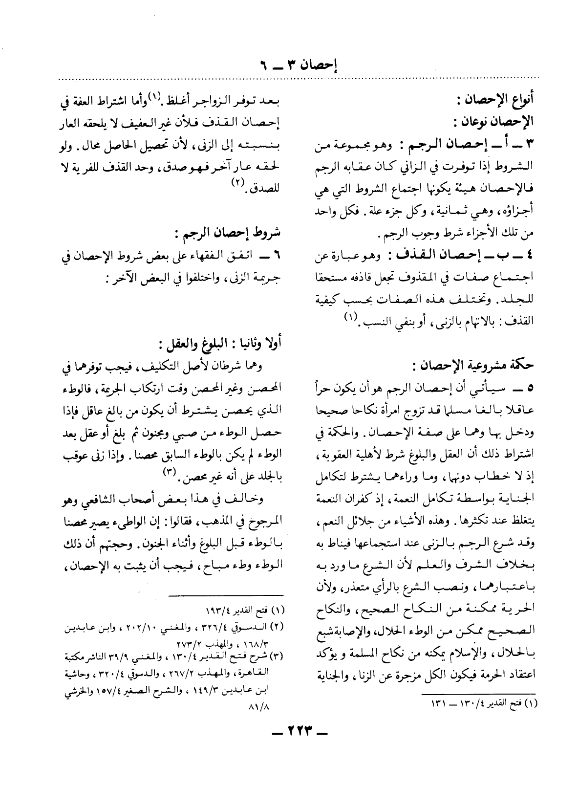 3 - أ - إِحْصَانُ الرَّجْمِ: وَهُوَ مَجْمُوعَةٌ مِنَ الشُّرُوطِ إِذَا تَوَفَّرَتْ فِي الزَّانِي كَانَ عِقَابُهُ الرَّجْمَ فَالإِْحْصَانُ هَيْئَةٌ يُكَوِّنُهَا اجْتِمَاعُ الشُّرُوطِ الَّتِي هِيَ أَجْزَاؤُهُ، وَهِيَ ثَمَانِيَةٌ، وَكُل جُزْءٍ عِلَّةٌ. فَكُل وَاحِدٍ مِنْ تِلْكَ الأَْجْزَاءِ شَرْطُ وُجُوبِ الرَّجْمِ.