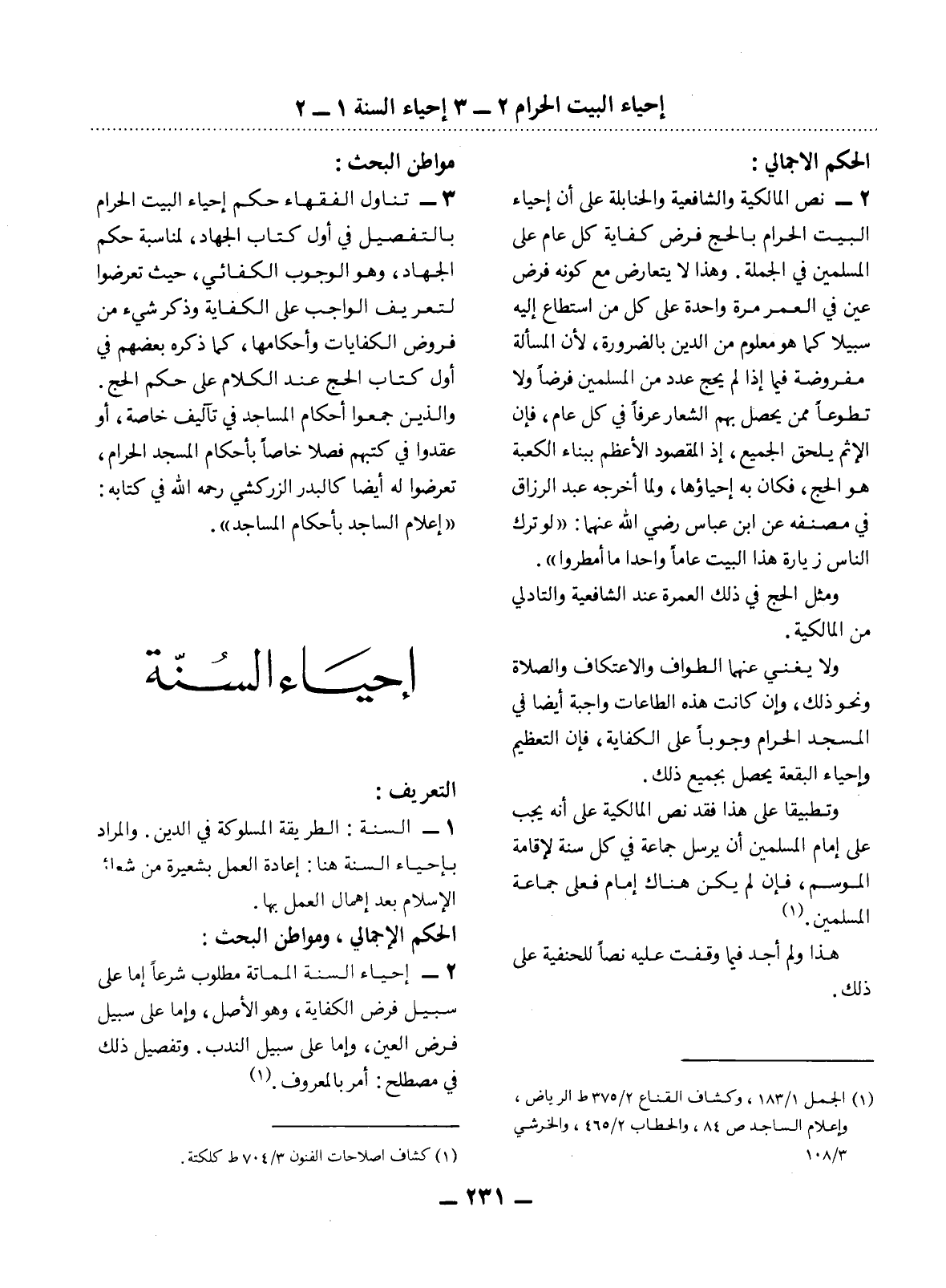 1 - السُّنَّةُ: الطَّرِيقَةُ الْمَسْلُوكَةُ فِي الدِّينِ. وَالْمُرَادُ بِإِحْيَاءِ السُّنَّةِ هُنَا: إِعَادَةُ الْعَمَل بِشَعِيرَةٍ مِنْ شَعَائِرِ الإِْسْلاَمِ بَعْدَ إِهْمَال الْعَمَل بِهَا.