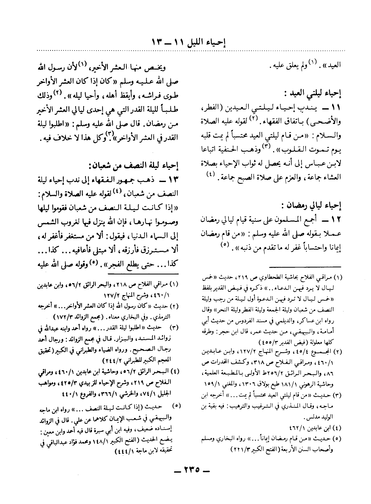 11 - يُنْدَبُ إِحْيَاءُ لَيْلَتَيِ الْعِيدَيْنِ (الْفِطْرِ، وَالأَْضْحَى) بِاتِّفَاقِ الْفُقَهَاءِ (2) . لِقَوْلِهِ عَلَيْهِ الصَّلَاةُ وَالسَّلَامُ: مَنْ قَامَ لَيْلَتَيِ الْعِيدِ مُحْتَسِبًا لَمْ يَمُتْ قَلْبُهُ يَوْمَ تَمُوتُ الْقُلُوبُ (3) . وَذَهَبَ الْحَنَفِيَّةُ اتِّبَاعًا لاِبْنِ عَبَّاسٍ إِلَى أَنَّهُ يَحْصُل لَهُ ثَوَابُ الإِْحْيَاءِ بِصَلاَةِ الْعِشَاءِ جَمَاعَةً، وَالْعَزْمِ عَلَى صَلاَةِ الصُّبْحِ جَمَاعَةً (4) .