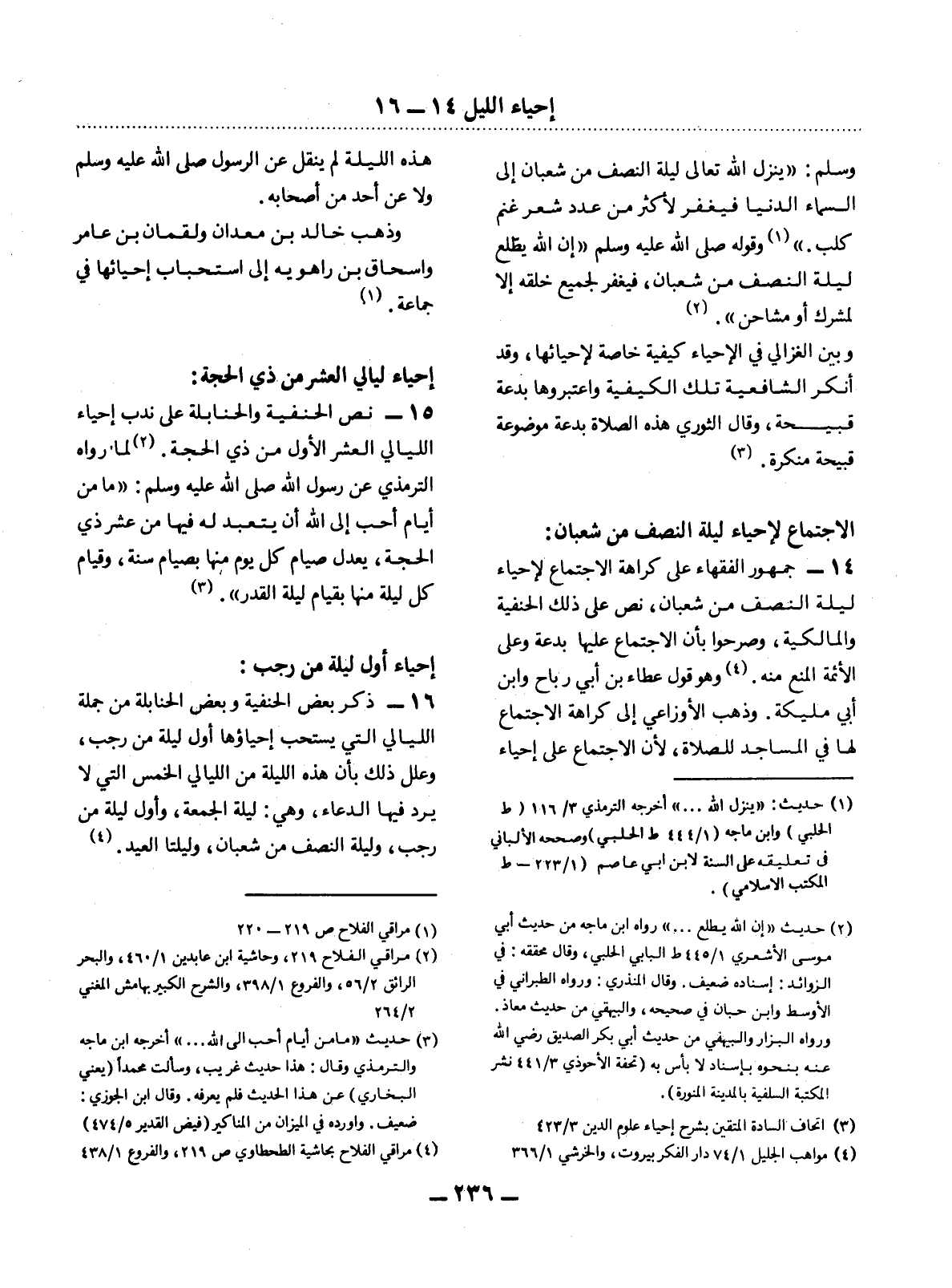 (1) حديث (إذا كانت ليلة النصف. . . " رواه ابن ماجه والبيهقي في شعب الإيمان كلاهما عن علي. قال في الزوائد إسناده ضعيف، وفيه ابن أبي سبرة قال فيه أحمد وابن معين: يضع الحديث (الفتح الكبير 1 / 148 ومحمد فؤاد عبد الباقي في تحقيقه لابن ماجه 1 / 444)
