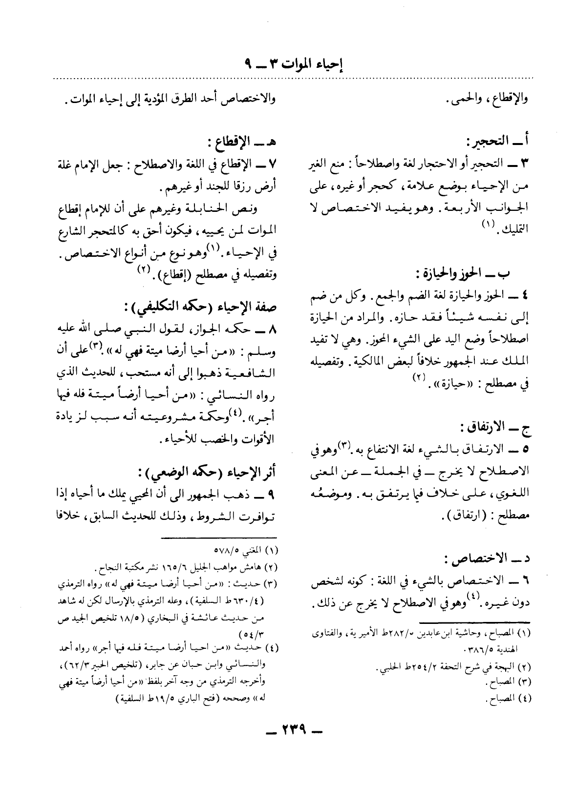 3 - التَّحْجِيرُ أَوِ الاِحْتِجَارُ لُغَةً وَاصْطِلاَحًا: مَنْعُ الْغَيْرِ مِنَ الإِْحْيَاءِ بِوَضْعِ عَلاَمَةٍ، كَحَجَرٍ أَوْ غَيْرِهِ، عَلَى الْجَوَانِبِ الأَْرْبَعَةِ وَهُوَ يُفِيدُ الاِخْتِصَاصَ لاَ التَّمْلِيكَ (1) .