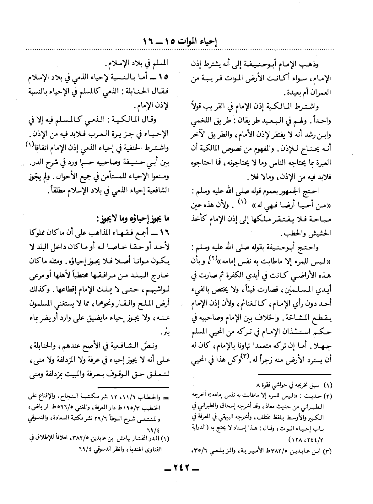 15 - أَمَّا بِالنِّسْبَةِ لإِِحْيَاءِ الذِّمِّيِّ فِي بِلاَدِ الإِْسْلاَمِ فَقَال الْحَنَابِلَةُ: الذِّمِّيُّ كَالْمُسْلِمِ فِي الإِْحْيَاءِ بِالنِّسْبَةِ لإِِذْنِ الإِْمَامِ. وَقَال الْمَالِكِيَّةُ: الذِّمِّيُّ كَالْمُسْلِمِ فِيهِ إِلاَّ فِي الإِْحْيَاءِ فِي جَزِيرَةِ الْعَرَبِ فَلاَ بُدَّ فِيهِ مِنَ الإِْذْنِ. وَاشْتَرَطَ الْحَنَفِيَّةُ فِي إِحْيَاءِ الذِّمِّيِّ إِذْنَ الإِْمَامِ اتِّفَاقًا (1) بَيْنَ أَبِي حَنِيفَةَ وَصَاحِبَيْهِ حَسْبَمَا وَرَدَ فِي شَرْحِ الدُّرِّ. وَمَنَعُوا الإِْحْيَاءَ لِلْمُسْتَأْمَنِ فِي جَمِيعِ الأَْحْوَال. وَلَمْ يُجَوِّزِ الشَّافِعِيَّةُ إِحْيَاءَ الذِّمِّيِّ فِي بِلاَدِ الإِْسْلاَمِ مُطْلَقًا.
