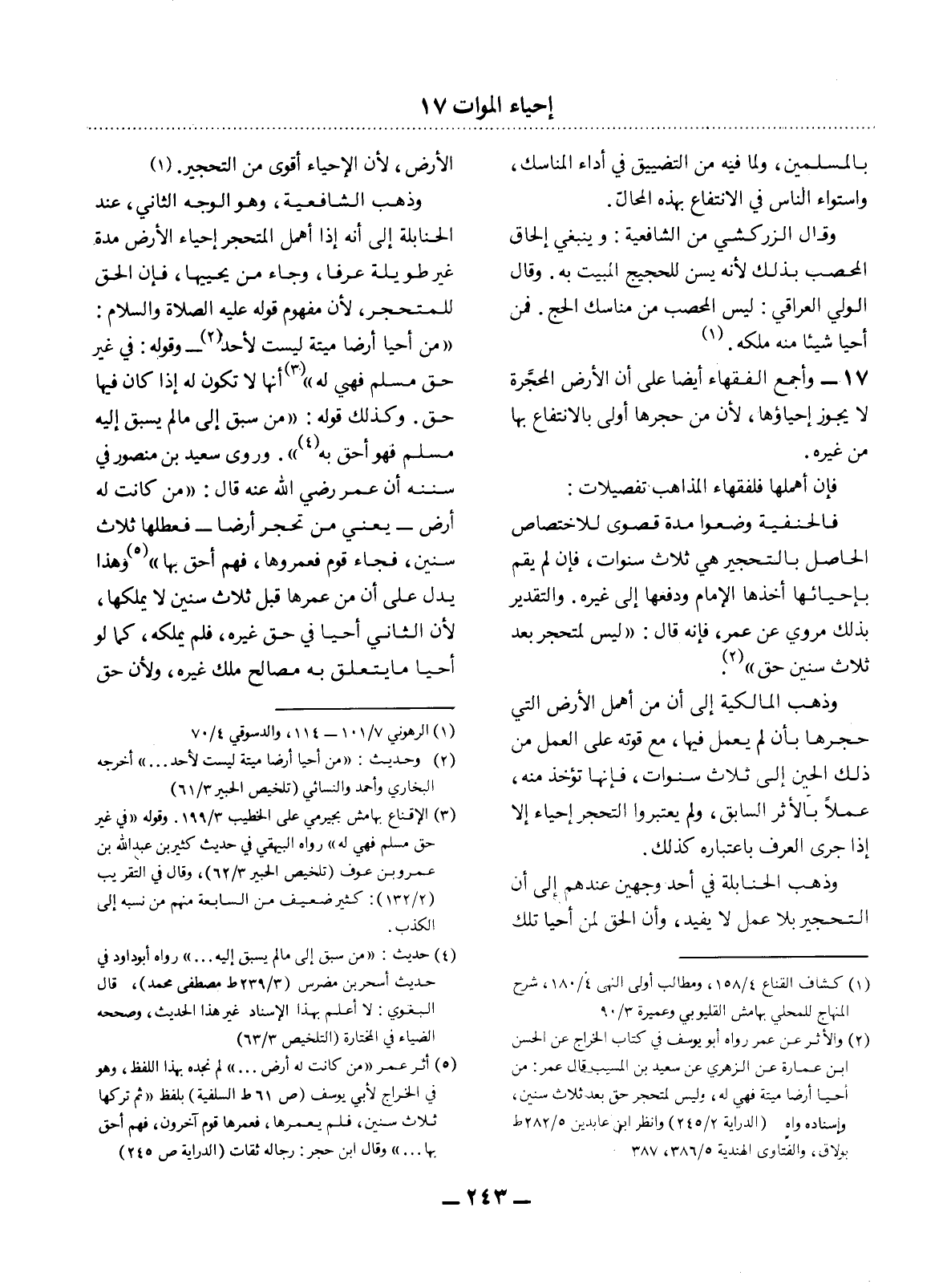 (2) والأثر عن عمر رواه أبو يوسف في كتاب الخراج عن الحسن بن عمارة عن الزهري عن سعيد بن المسيب قال عمر: من أحيا أرضا ميتة فهي له، وليس لمتحجر حق بعد ثلاث سنين، وإسناده واه (الدراية 2 / 245) وانظر ابن عابدين 5 / 282 ط بولاق، والفتاوى الهندية 5 / 386،387