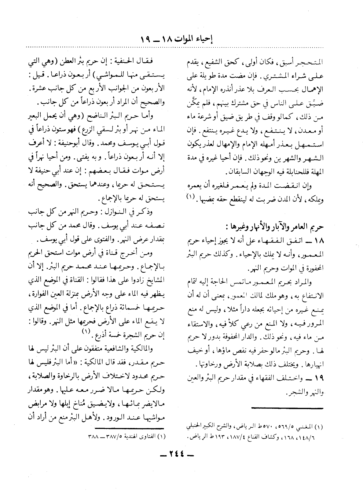 18 - اتَّفَقَ الْفُقَهَاءُ عَلَى أَنَّهُ لاَ يَجُوزُ إِحْيَاءُ حَرِيمِ الْمَعْمُورِ، وَأَنَّهُ لاَ يُمْلَكُ بِالإِْحْيَاءِ. وَكَذَلِكَ حَرِيمُ الْبِئْرِ الْمَحْفُورَةِ فِي الْمَوَاتِ وَحَرِيمُ النَّهْرِ. وَالْمُرَادُ بِحَرِيمِ الْمَعْمُورِ مَا تَمَسُّ الْحَاجَةُ إِلَيْهِ لِتَمَامِ الاِنْتِفَاعِ بِهِ، وَهُوَ مِلْكٌ لِمَالِكِ الْمَعْمُورِ، بِمَعْنَى أَنَّ لَهُ أَنْ يَمْنَعَ غَيْرَهُ مِنْ إِحْيَائِهِ بِجَعْلِهِ دَارًا مَثَلاً، وَلَيْسَ لَهُ مَنْعُ الْمُرُورِ فِيهِ، وَلاَ الْمَنْعُ مِنْ رَعْيِ كَلأٍَ فِيهِ، وَالاِسْتِقَاءُ مِنْ مَاءٍ فِيهِ، وَنَحْوُ ذَلِكَ. وَالدَّارُ الْمَحْفُوفَةُ بِدُورٍ لاَ حَرِيمَ لَهَا. وَحَرِيمُ الْبِئْرِ مَا لَوْ حَفَرَ فِيهِ نَقَصَ مَاؤُهَا، أَوْ خِيفَ انْهِيَارُهَا. وَيَخْتَلِفُ ذَلِكَ بِصَلاَبَةِ الأَْرْضِ وَرَخَاوَتِهَا.
