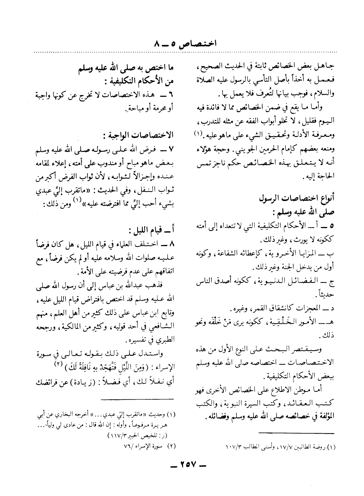 8 - اخْتَلَفَ الْعُلَمَاءُ فِي قِيَامِ اللَّيْل، هَل كَانَ فَرْضًا عَلَيْهِ صَلَوَاتُ اللَّهِ وَسَلاَمُهُ عَلَيْهِ أَوْ لَمْ يَكُنْ فَرْضًا، مَعَ اتِّفَاقِهِمْ عَلَى عَدَمِ فَرْضِيَّتِهِ عَلَى الأُْمَّةِ. فَذَهَبَ عَبْدُ اللَّهِ بْنُ عَبَّاسٍ إِلَى أَنَّ رَسُول اللَّهِ صَلَّى اللَّهُ عَلَيْهِ وَسَلَّمَ قَدِ اخْتُصَّ بِافْتِرَاضِ قِيَامِ اللَّيْل عَلَيْهِ، وَتَابَعَ ابْنَ عَبَّاسٍ عَلَى ذَلِكَ كَثِيرٌ مِنْ أَهْل الْعِلْمِ، مِنْهُمُ الشَّافِعِيُّ فِي أَحَدِ قَوْلَيْهِ، وَكَثِيرٌ مِنَ الْمَالِكِيَّةِ، وَرَجَّحَهُ الطَّبَرِيُّ فِي تَفْسِيرِهِ. وَاسْتَدَل عَلَى ذَلِكَ بِقَوْلِهِ تَعَالَى فِي سُورَةِ الإِْسْرَاءِ: {وَمِنَ اللَّيْل فَتَهَجَّدْ بِهِ نَافِلَةً لَكَ} (2) أَيْ نَفْلاً لَكَ، أَيْ فَضْلاً: (زِيَادَةً) عَنْ فَرَائِضِكَ