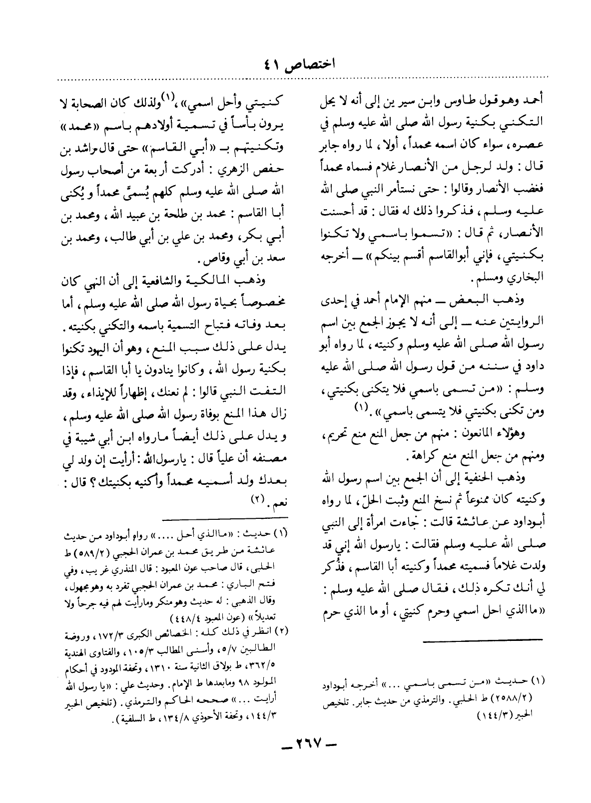(1) حديث " من تسمى باسمي. . . " أخرجه أبو داود (2 / 2588) ط الحلبي. والترمذي من حديث جابر. تلخيص الحبير (3 / 144)